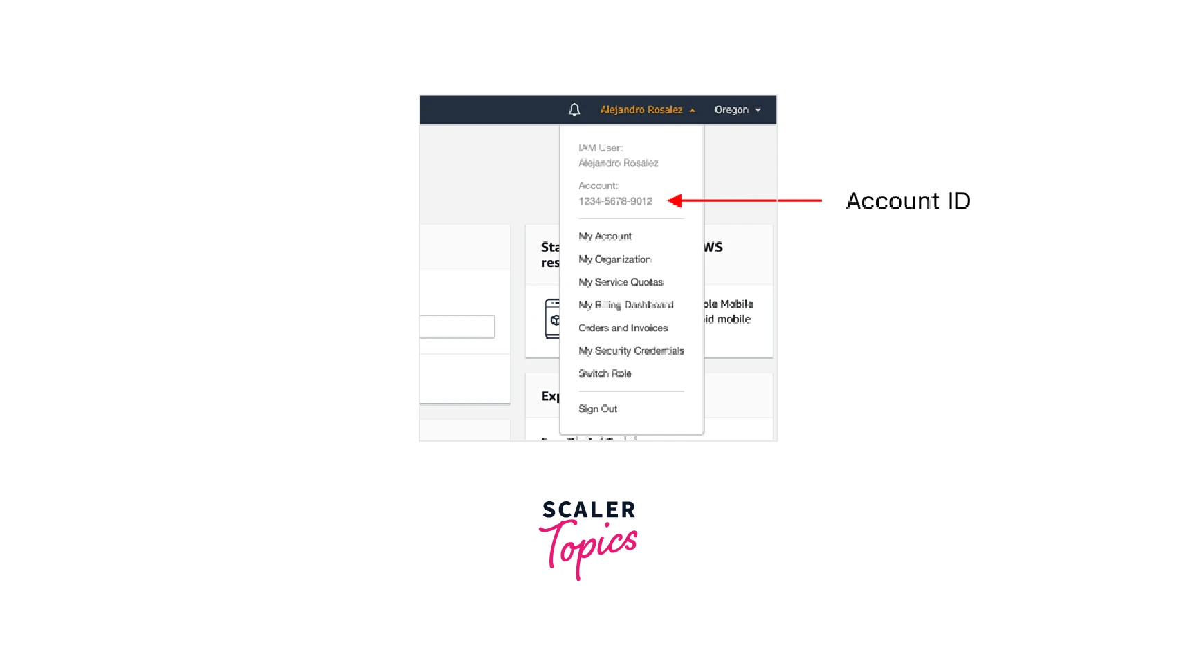 - Click your name in the top right corner of the AWS dashboard.