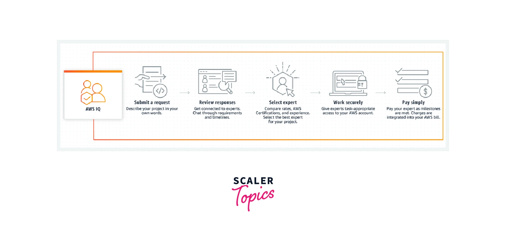 The above image demonstrates how AWS IQ works for customers, including making requests, examining expert responses, choosing an expert, working securely, and paying the expert.