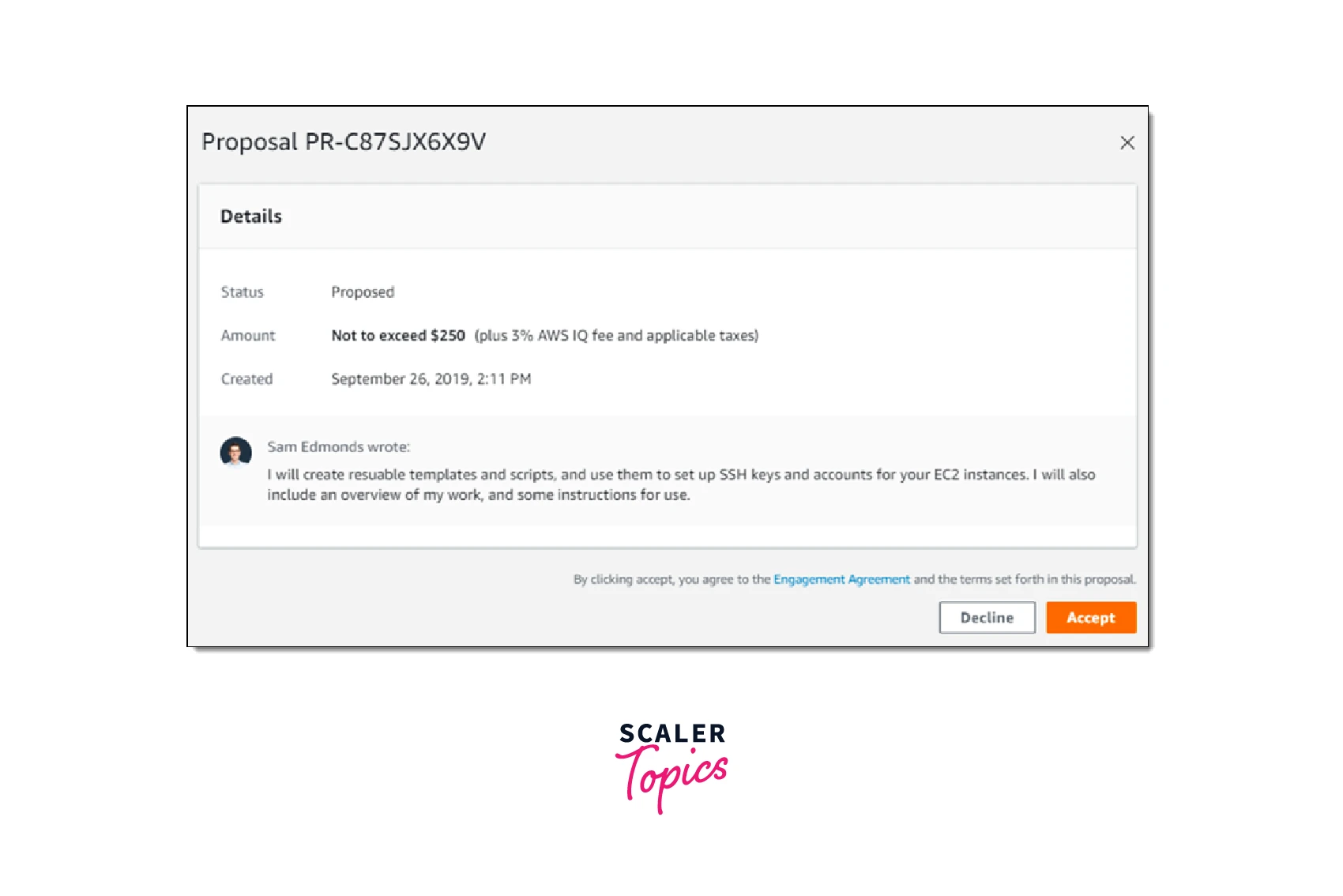 Now let's understand from an AWS IQ Expert point of view that after the customers submit their requests, it's time for the experts to respond. When customers make requests, Experts can regard them. With the help of the expert public profile page, customers can also get in touch directly. Experts discuss the project's specifics with the customer before starting the project. They develop a proposal containing tasks, deadlines, and payment arrangements for their customers. Customers also offer some required permissions of their AWS account that are necessary for the task, and the experts work in their account on their behalf. When the Specified tasks are completed, the experts get paid according to the proposal's parameters.
