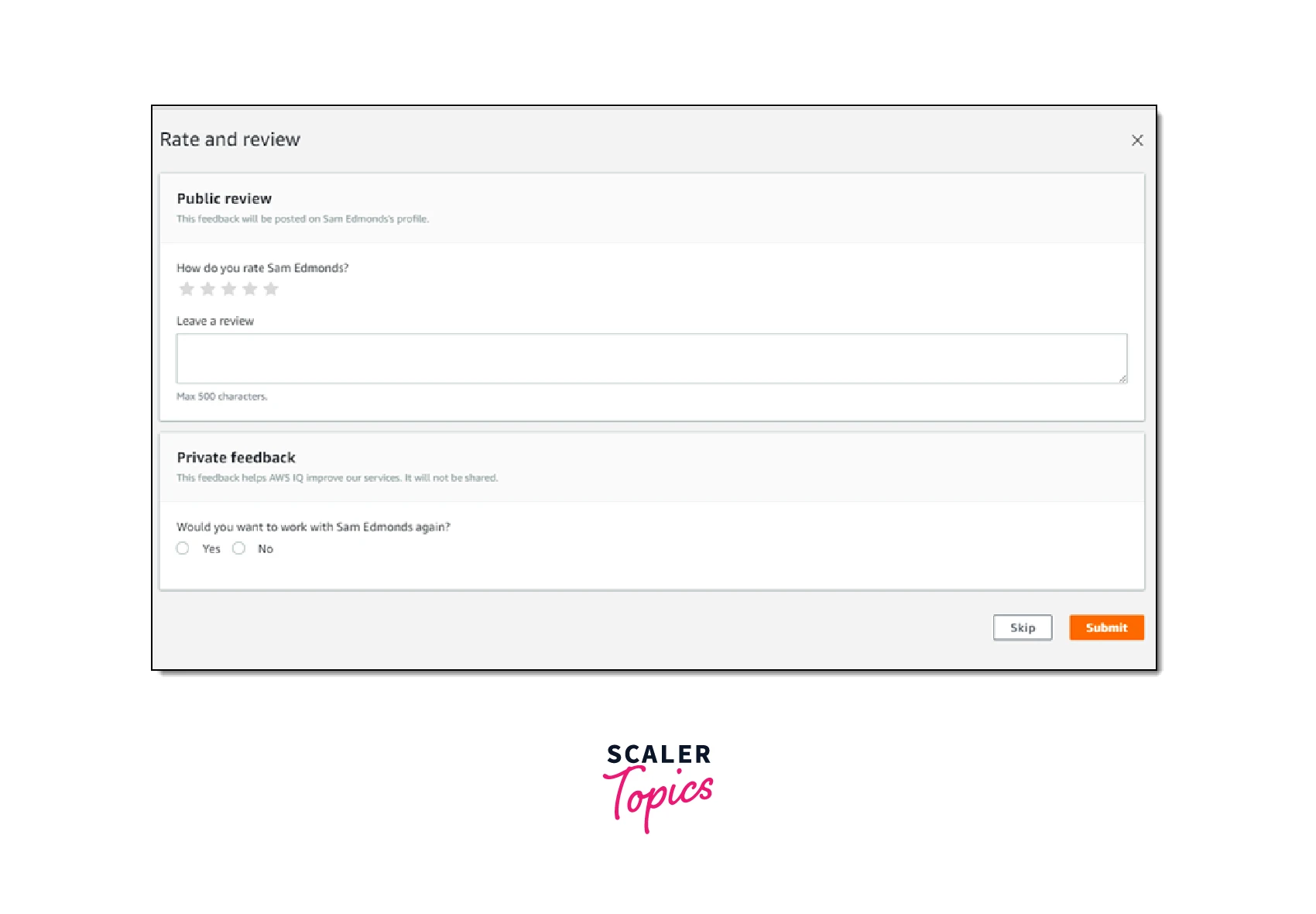 Now that the project is complete, provide the expert with public and private feedback. The public comments will be reflected on their profile, assisting potential clients in validating the caliber of a developer's work.