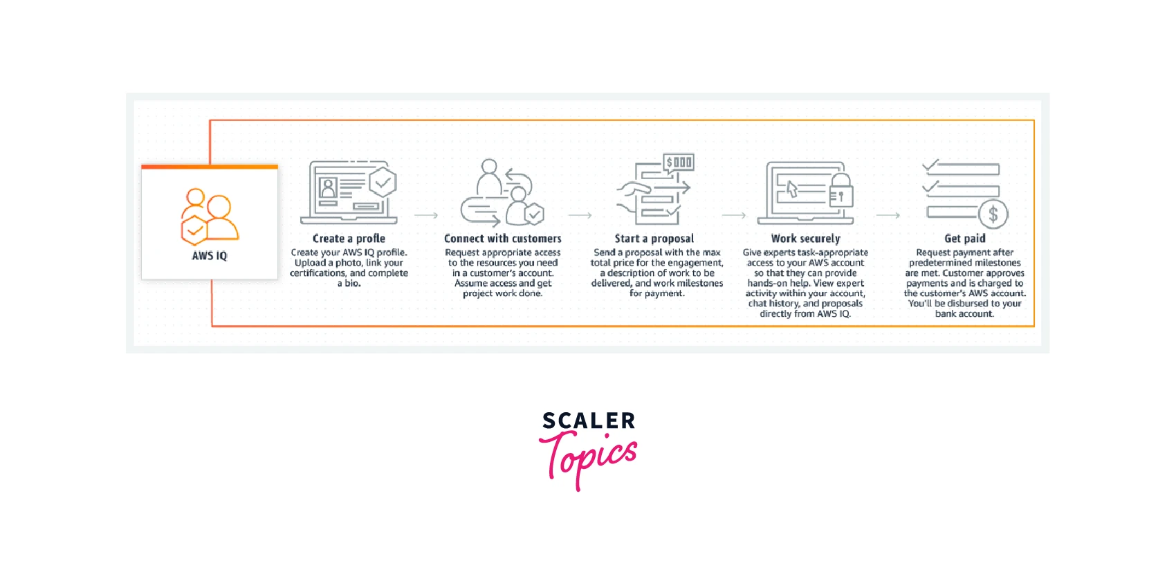 The above image demonstrates an AWS IQ expert's steps to set up a profile, connect with customers, begin a proposal, work securely to finish the task, and then ask for payment.