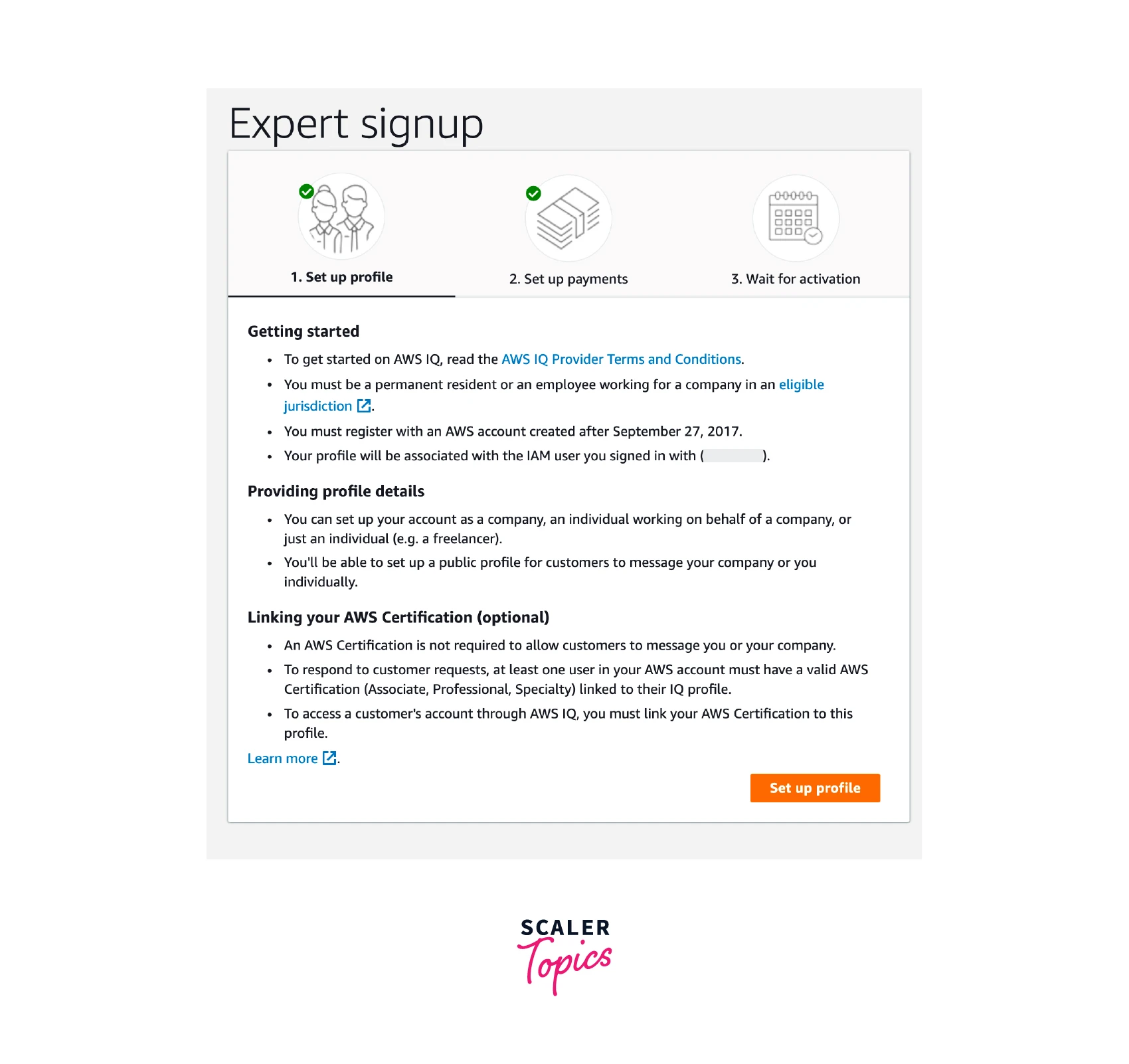 - Select Set up a profile from the Expert signup menu, then fill in your profile details. See Setting up your individual or business details in AWS IQ for additional instructions on creating your profile.