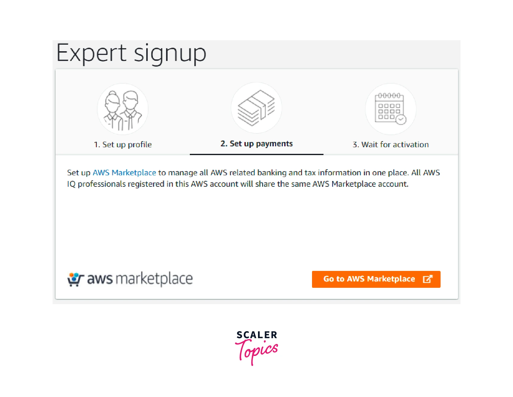 - To set up an AWS Marketplace account with your payment details, select Go to AWS Marketplace from the Expert signup menu, then select Set up payments. Visit Set up payments in AWS IQ for further details on how to set up payments.