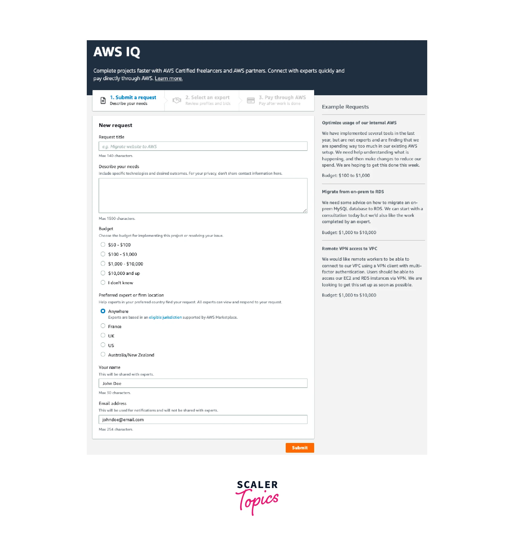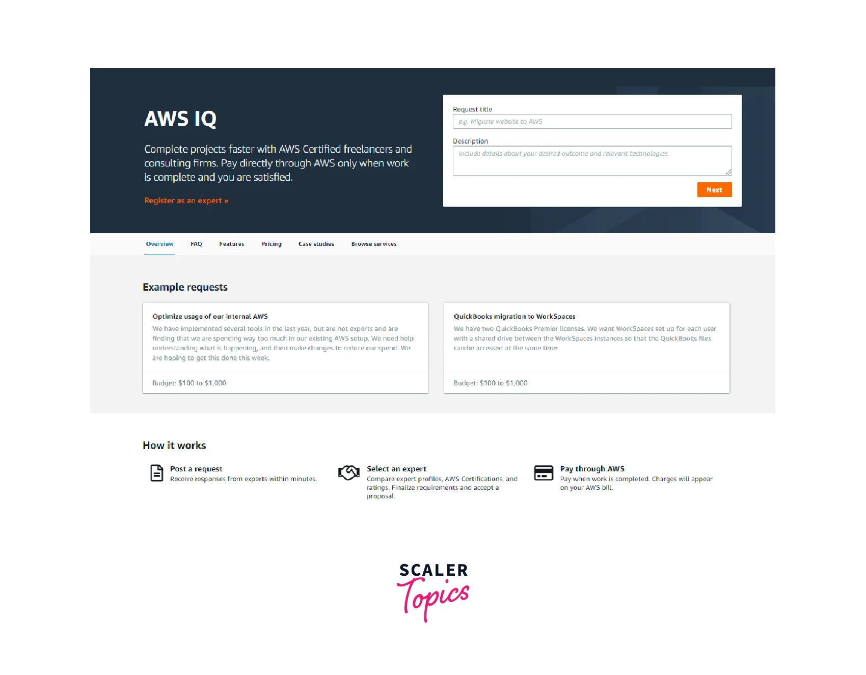 AWS IQ is an Amazon service that links customers with AWS-certified experts to get better support. It helps to consult with specialists about the project. An expert can begin work once you accept their proposal, which includes the project's deadlines, maximum price, and terms. To complete the task, you may have to give some access to your AWS account. You can pay the specialist directly from your AWS account once the project milestones have been completed.