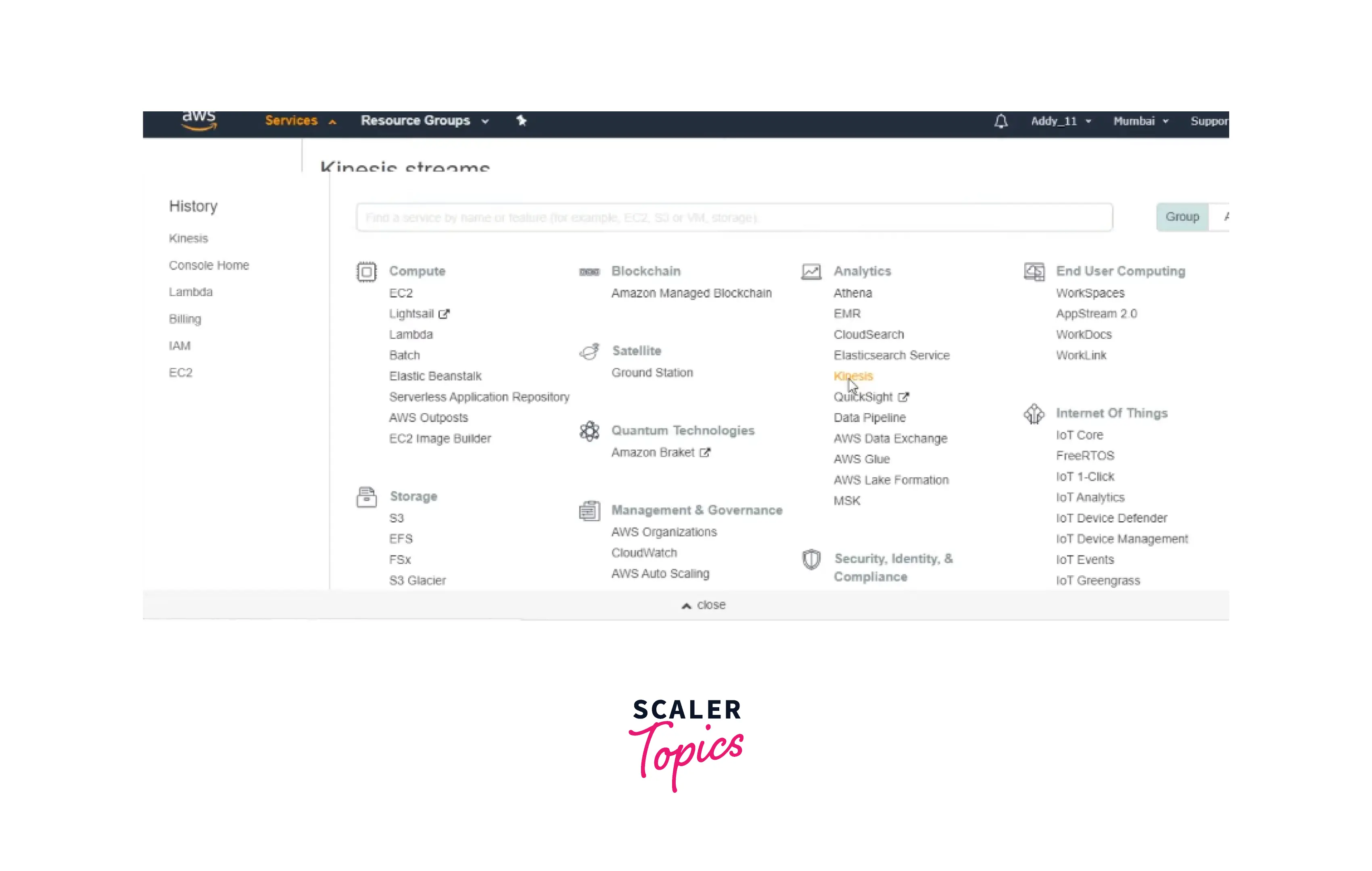 - Users have to login into Amazon Console, click on services, and then click on kinesis in the analytics section of services.