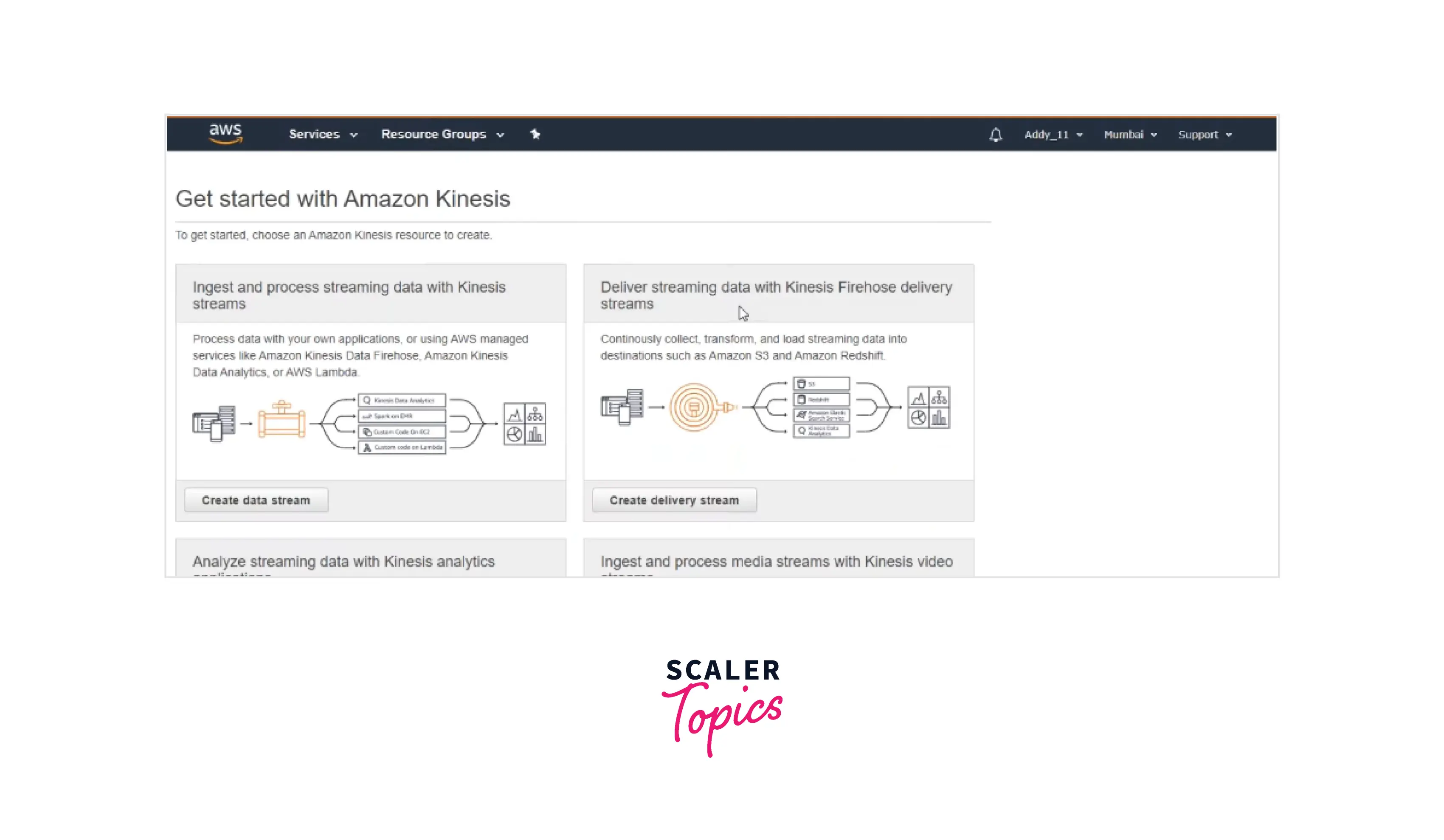 - Now, you can see the four capabilities of AWS Kinesis, i.e., data stream, delivery stream, analytics, and video stream.