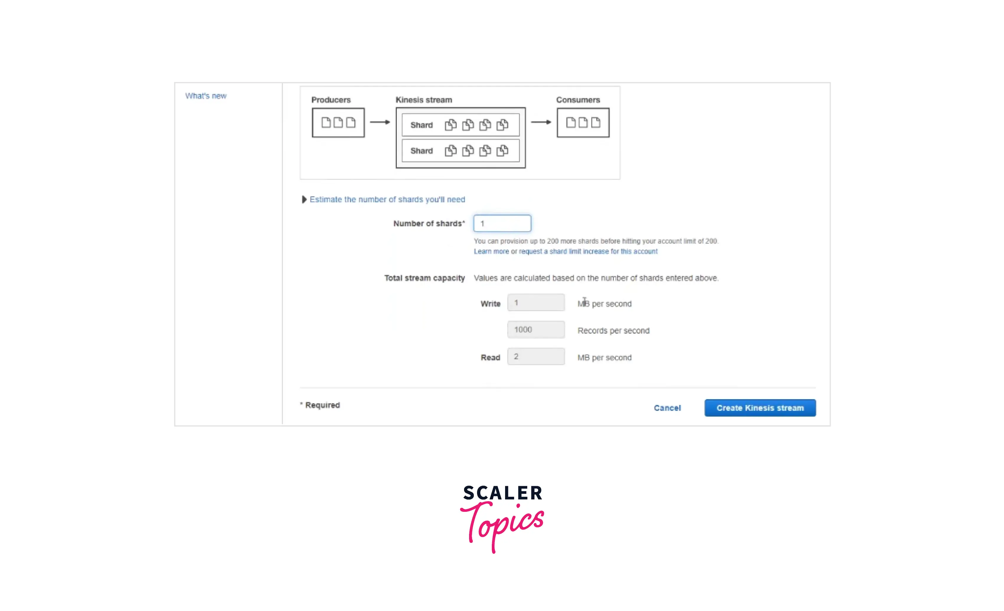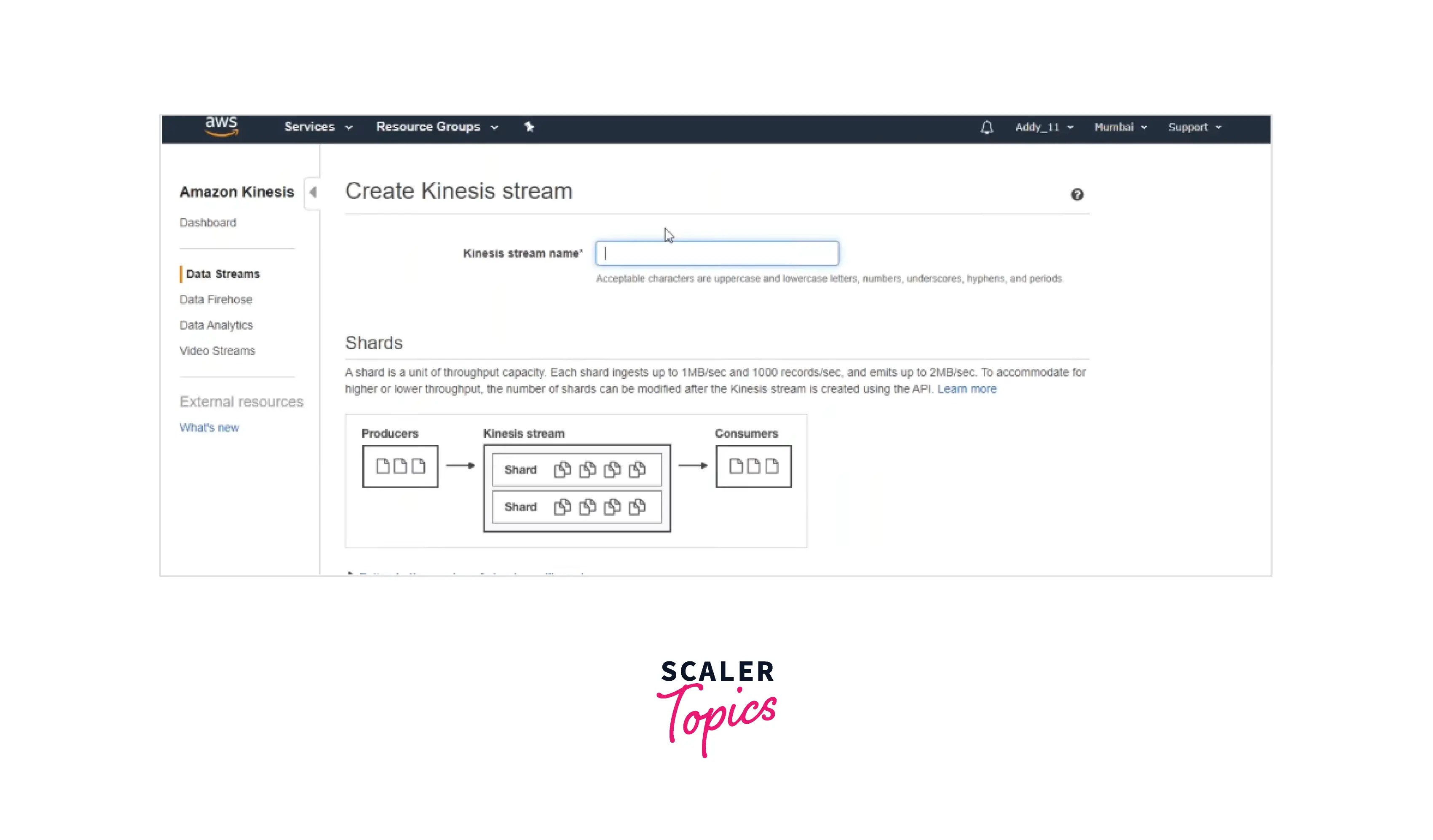 - As of now, click on "Create data stream." Now you specify the stream name. Scroll down and provide the number of shards. Click on "Create Kinesis stream."