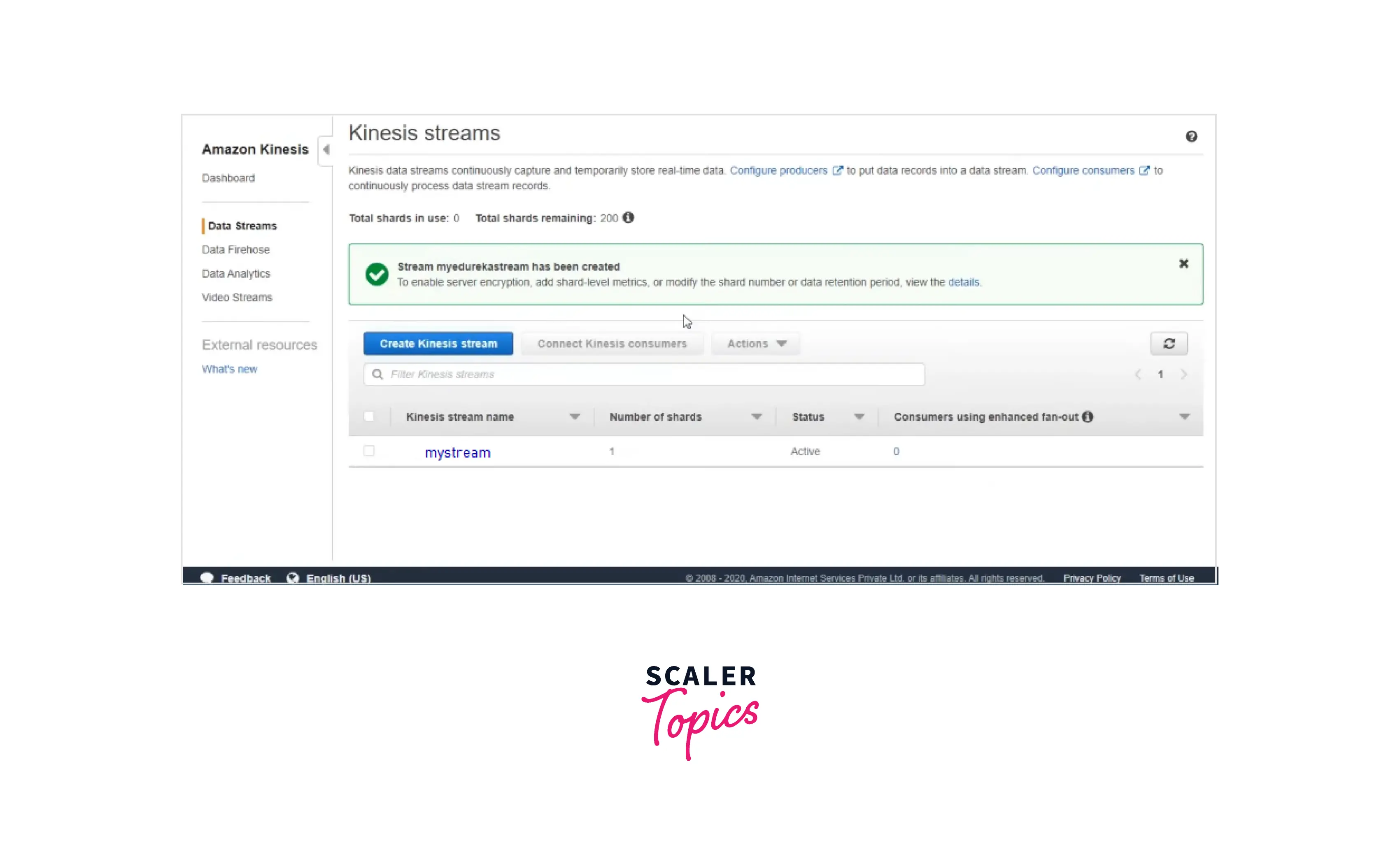 - Now you can see that stream has been created; this takes just a few seconds. You can connect your application to this kinesis, and you are good to go.