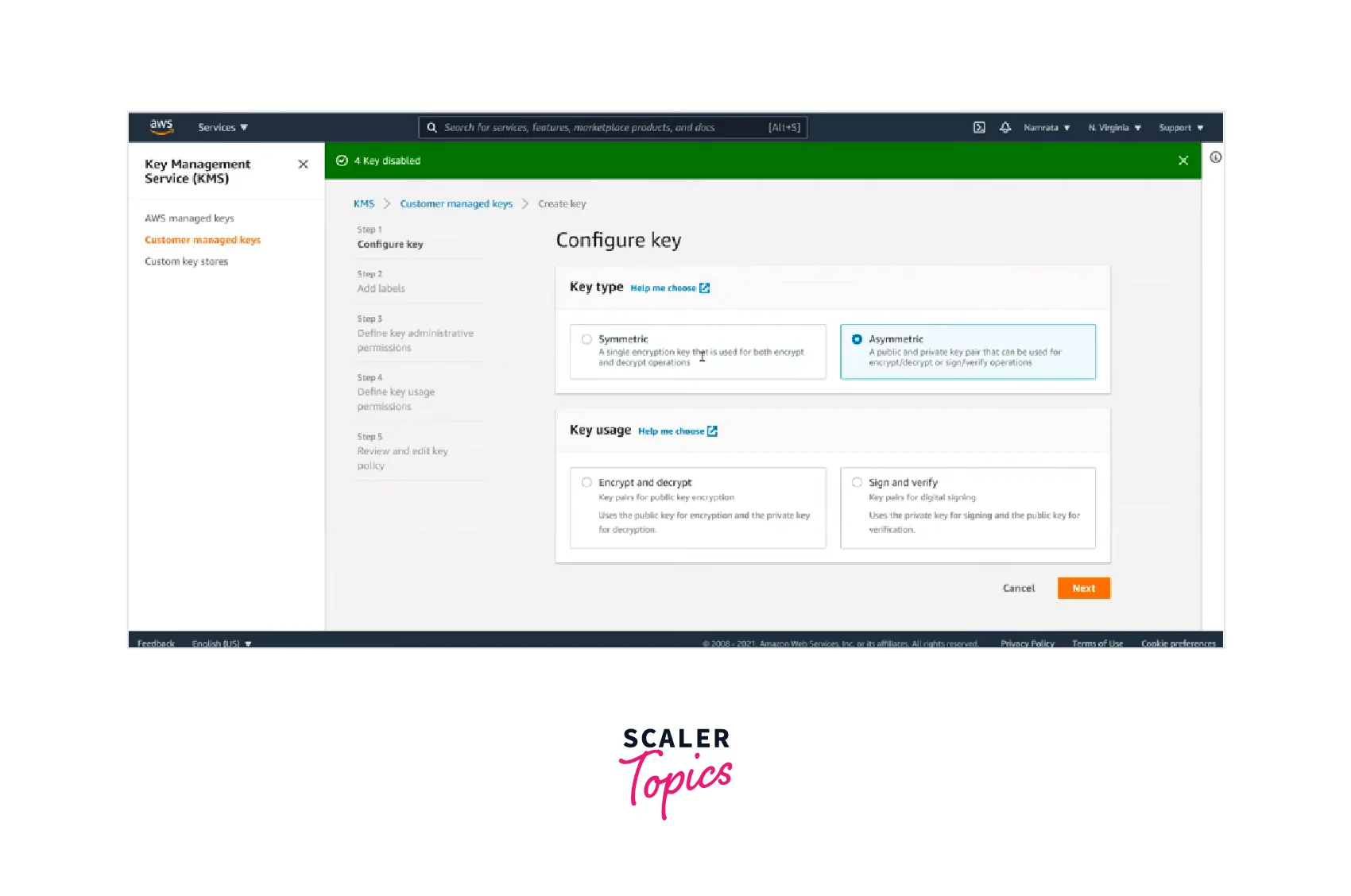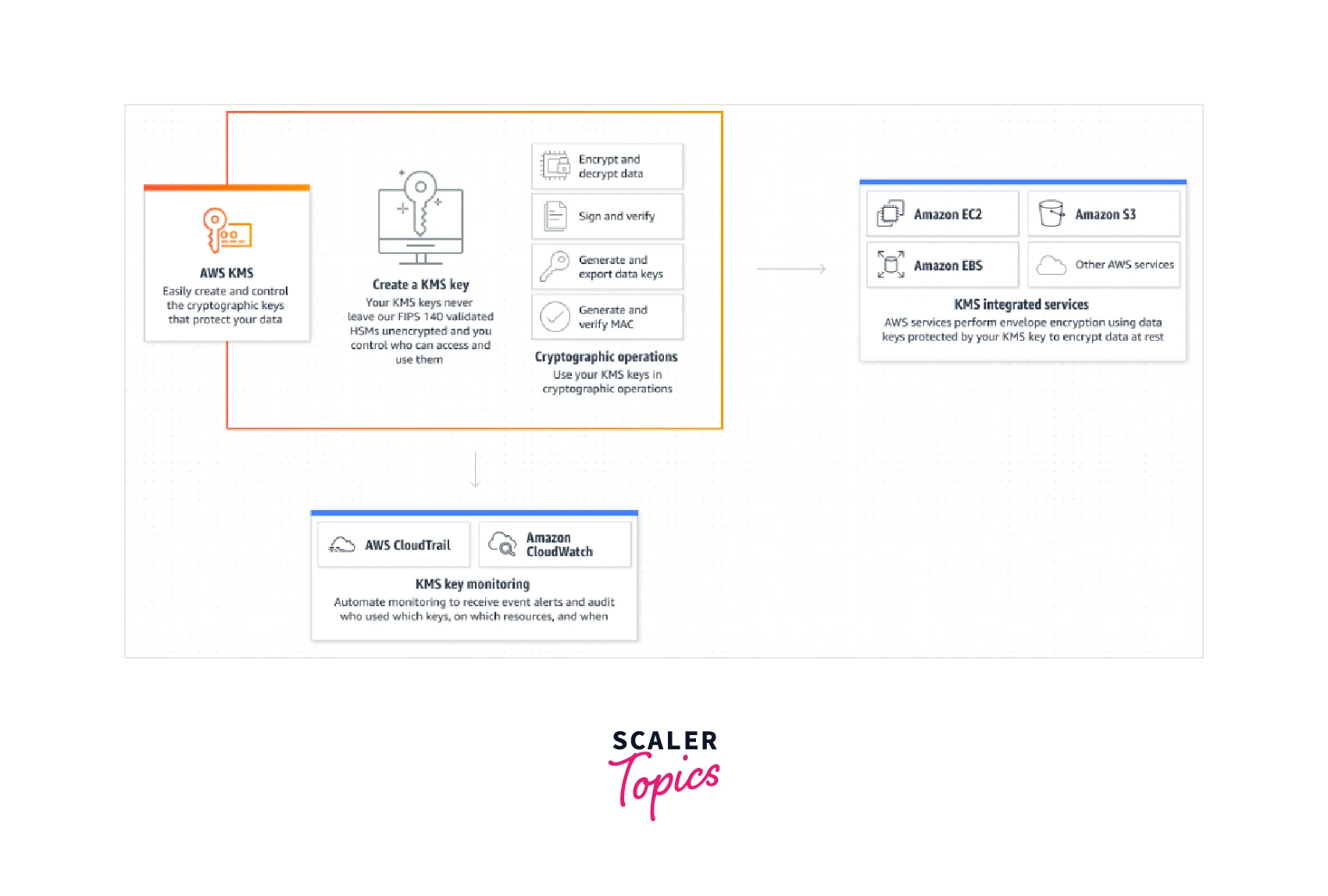 Asymmetric Keys: AWS KMS allows you to create and use asymmetric KMS keys and data key pairs. A KMS key can be designated for usage as a signing key pair or an encryption key pair. Inside Hardware Security Modules (HSMs), key pair creation and asymmetric cryptographic operations using these KMS keys are carried out.