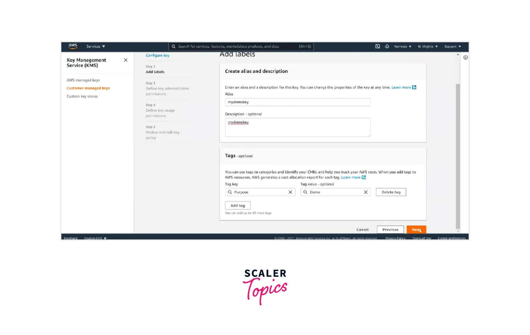- Add labels by entering the alias name and description and can also specify the optional tags. Click on Next.