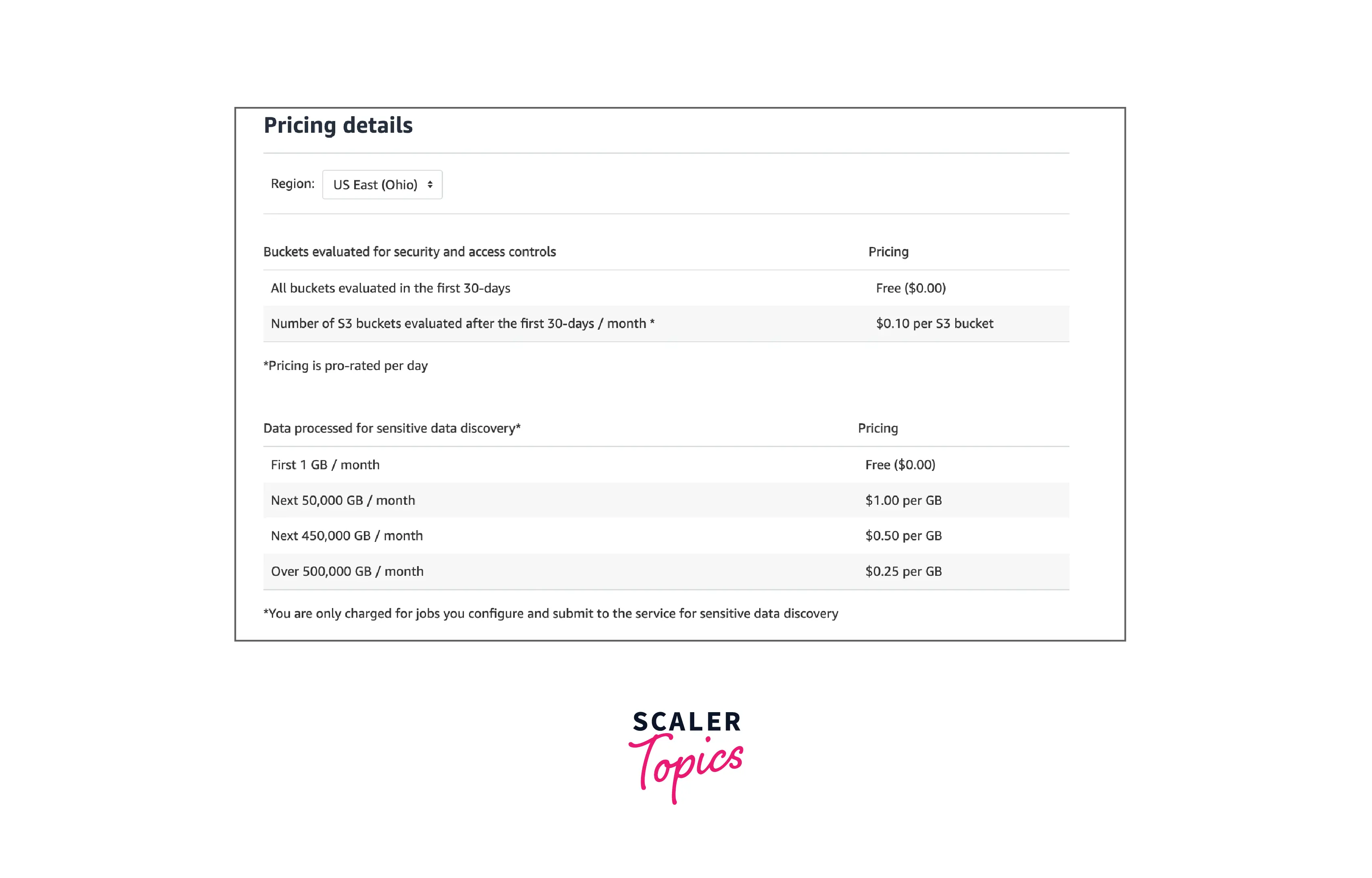 While scheduling the sensitive data discovery jobs, AWS Macie doesn't charge you for the first 1 GB of data processed every month for each account. After this, you start getting charged for each GB of data processed ( $0.10 per S3 bucket and month) as shown in the pricing details table above.