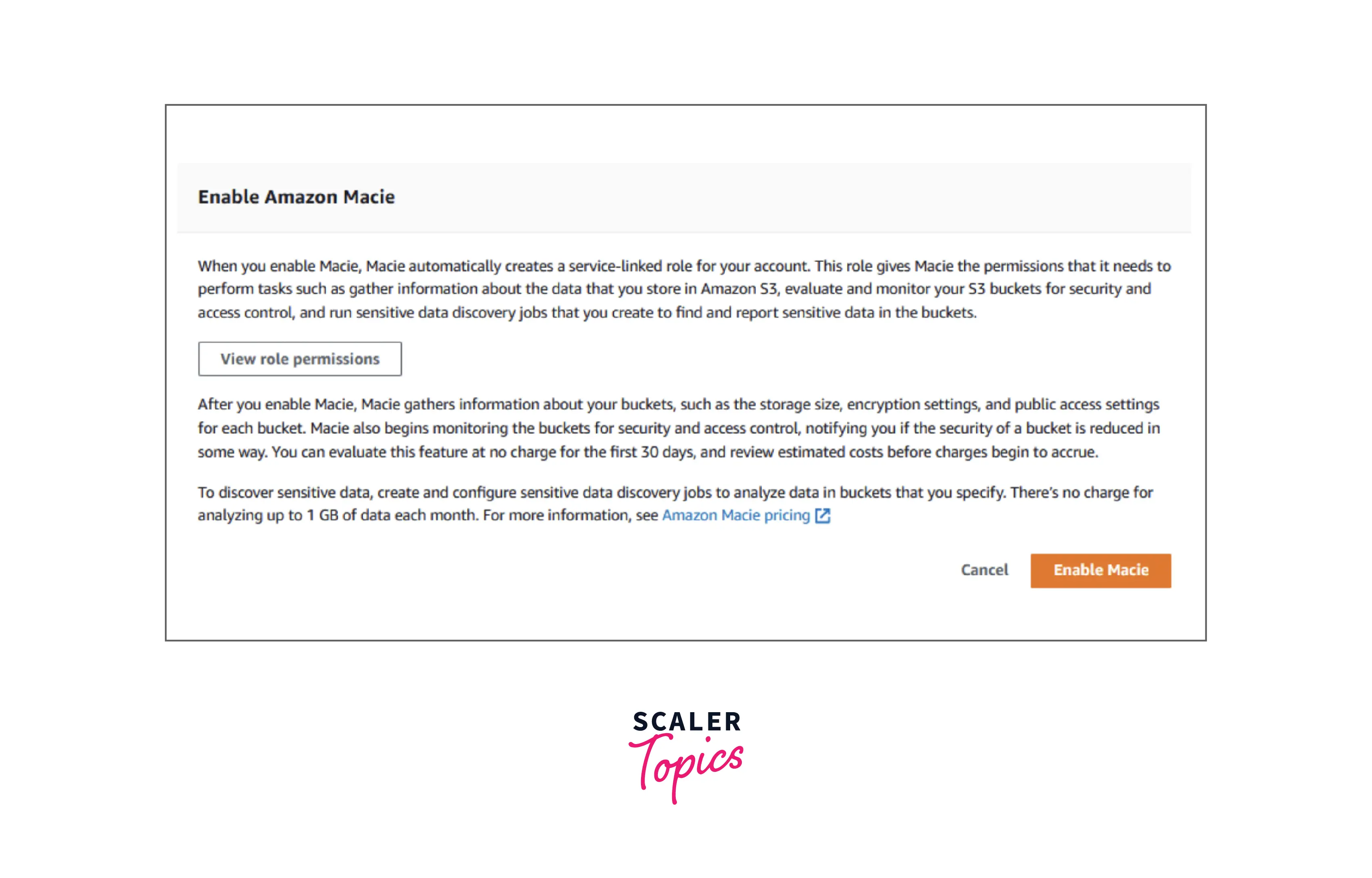 Now you shall see the description in the below image. Move ahead to choose the "Enable Macie" option.