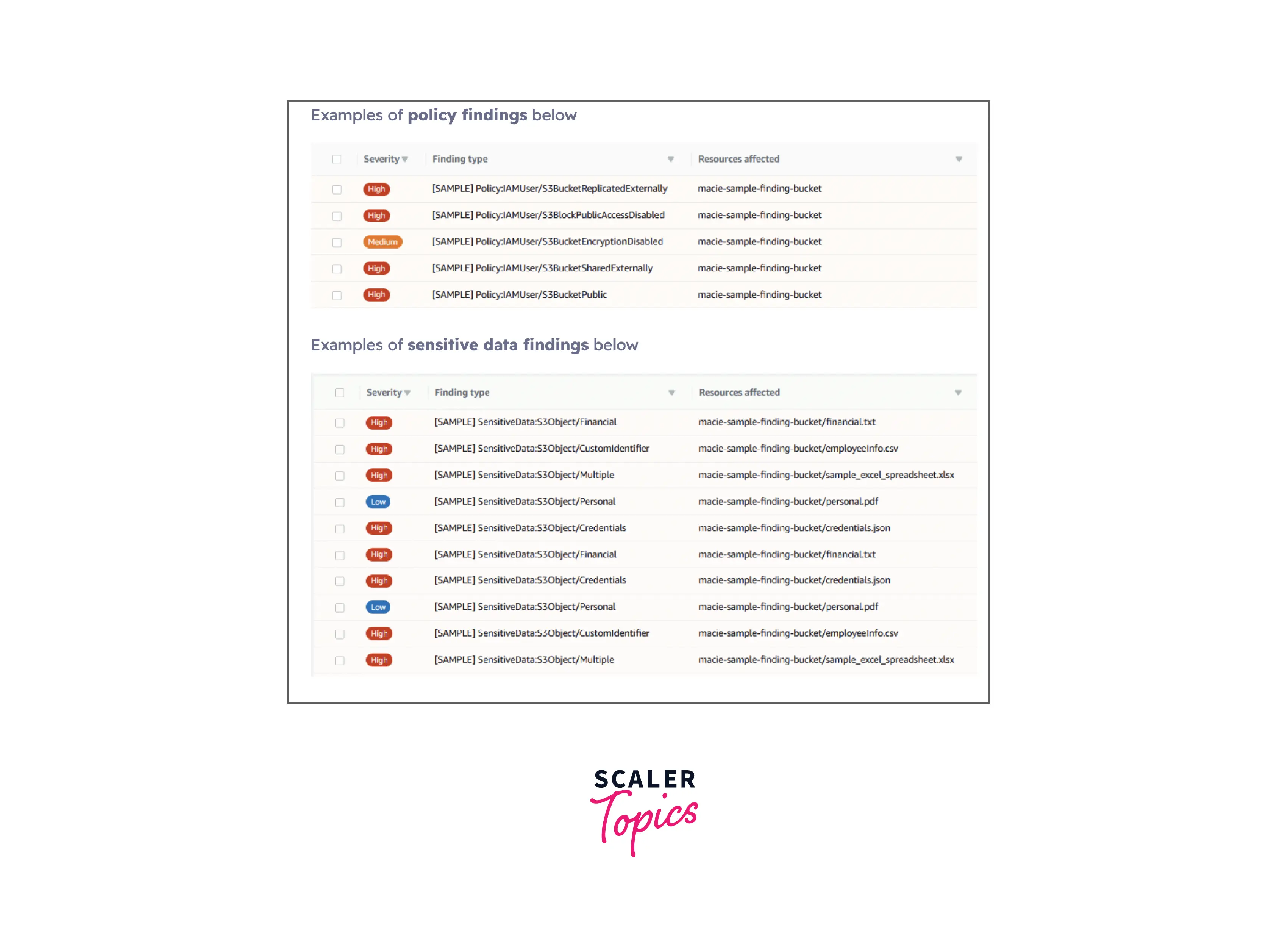 AWS Macie Findings is defined as a detailed report for sensitive data residing in the S3 buckets or S3 objects, where all the potential violations in the policy are listed. AWS Macie has two types of findings :- Policy findings :