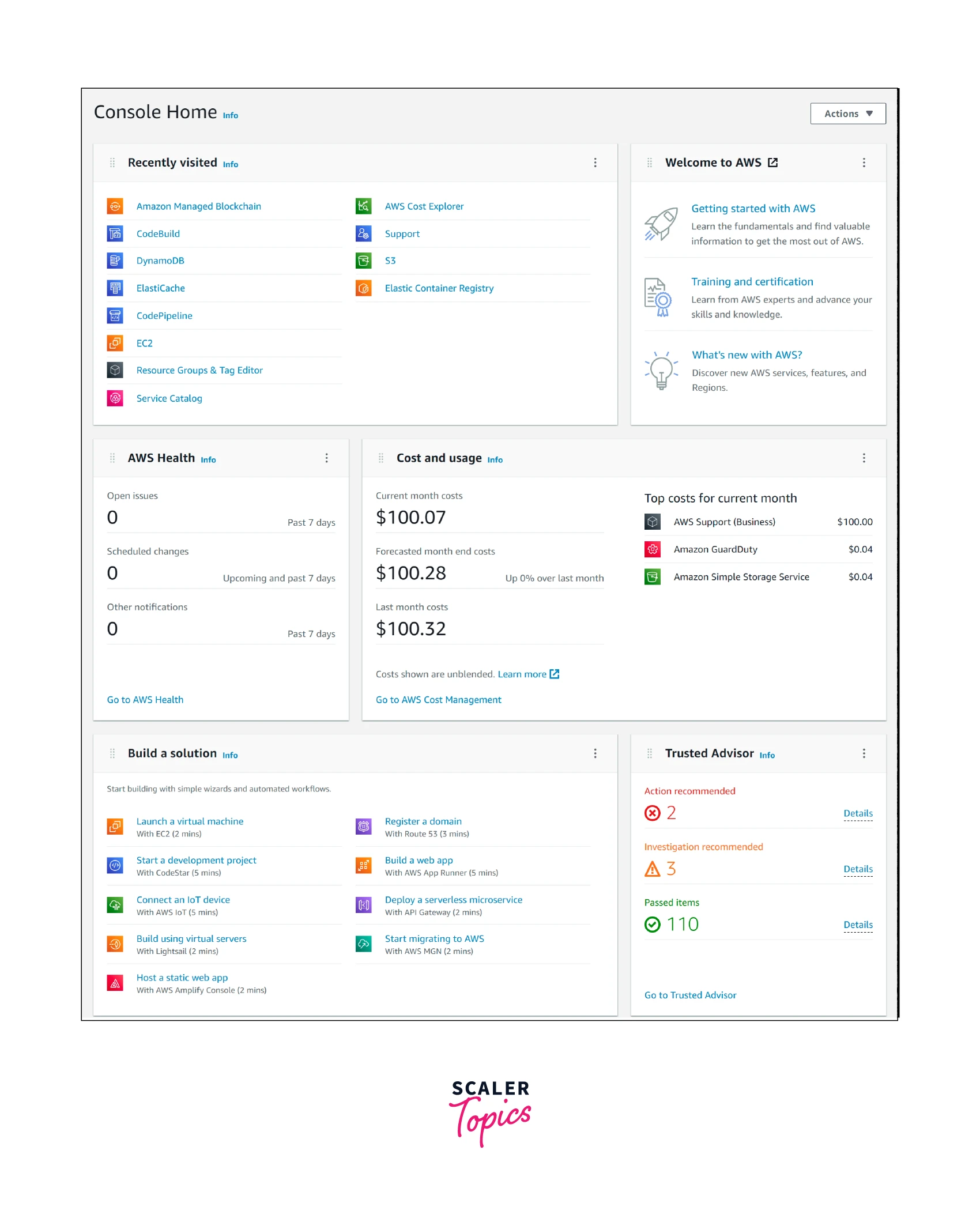 The AWS management console is a web application that is used to interact with the various AWS services. Or to put it another way, the AWS Console is a low-code platform for interacting with the AWS services. In the case of AWS, a low-code platform simply works with the graphical user interface to manage the cloud infrastructure without the need for prior programming knowledge. It gives users access to AWS services that are hosted in AWS data centers spread across various geographical locations, known as AWS Regions. Additionally, it offers access to manage account information and billing details. AWS also provides a comprehensive billing report created for the services a customer is using. The home page of the AWS console offers consolidated data on the AWS Health, cost, usage, recently used services, quick access, and trusted advisor reports that can be organized using widgets.