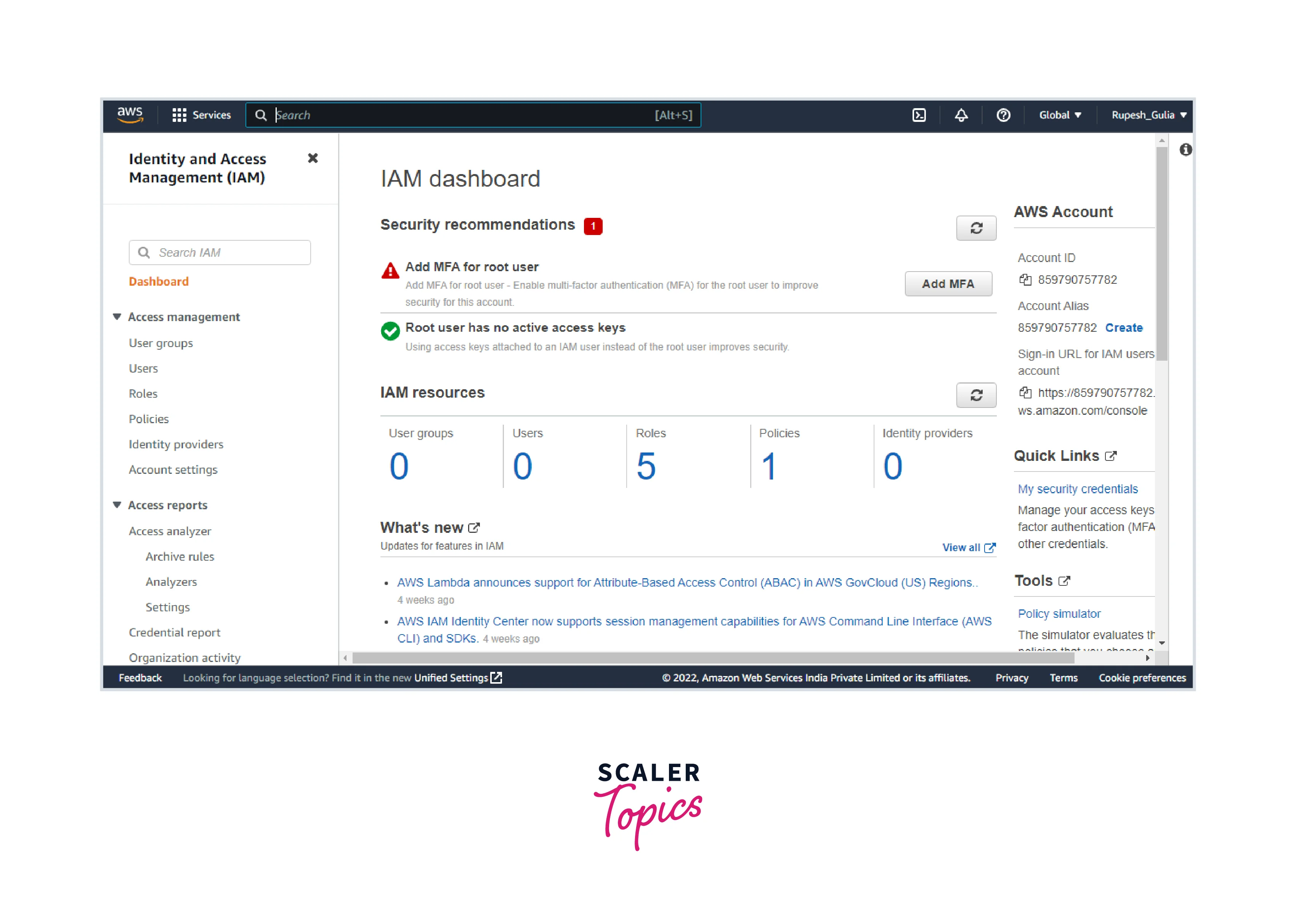 - Log in to the AWS Management Console and go to IAM Dashboard.