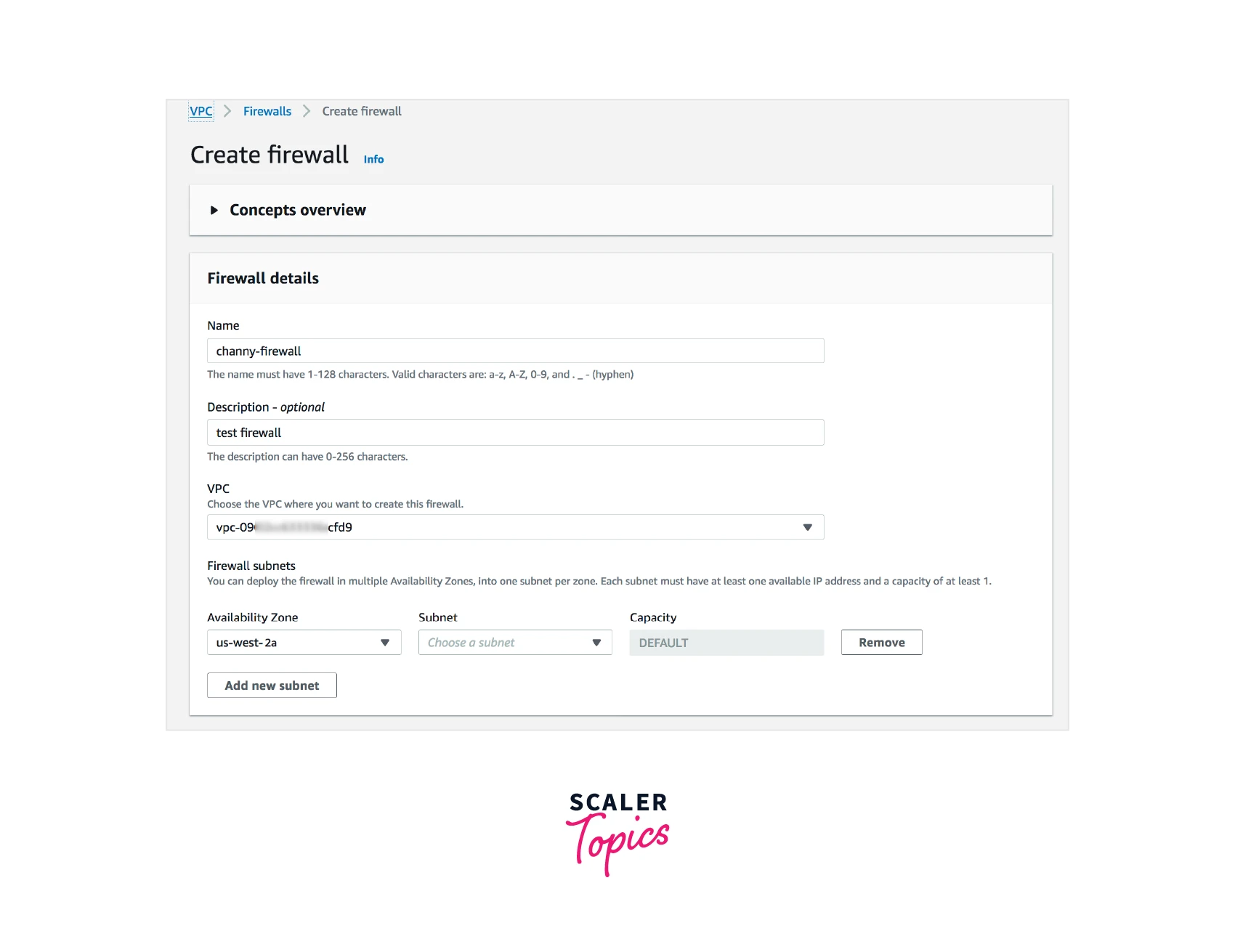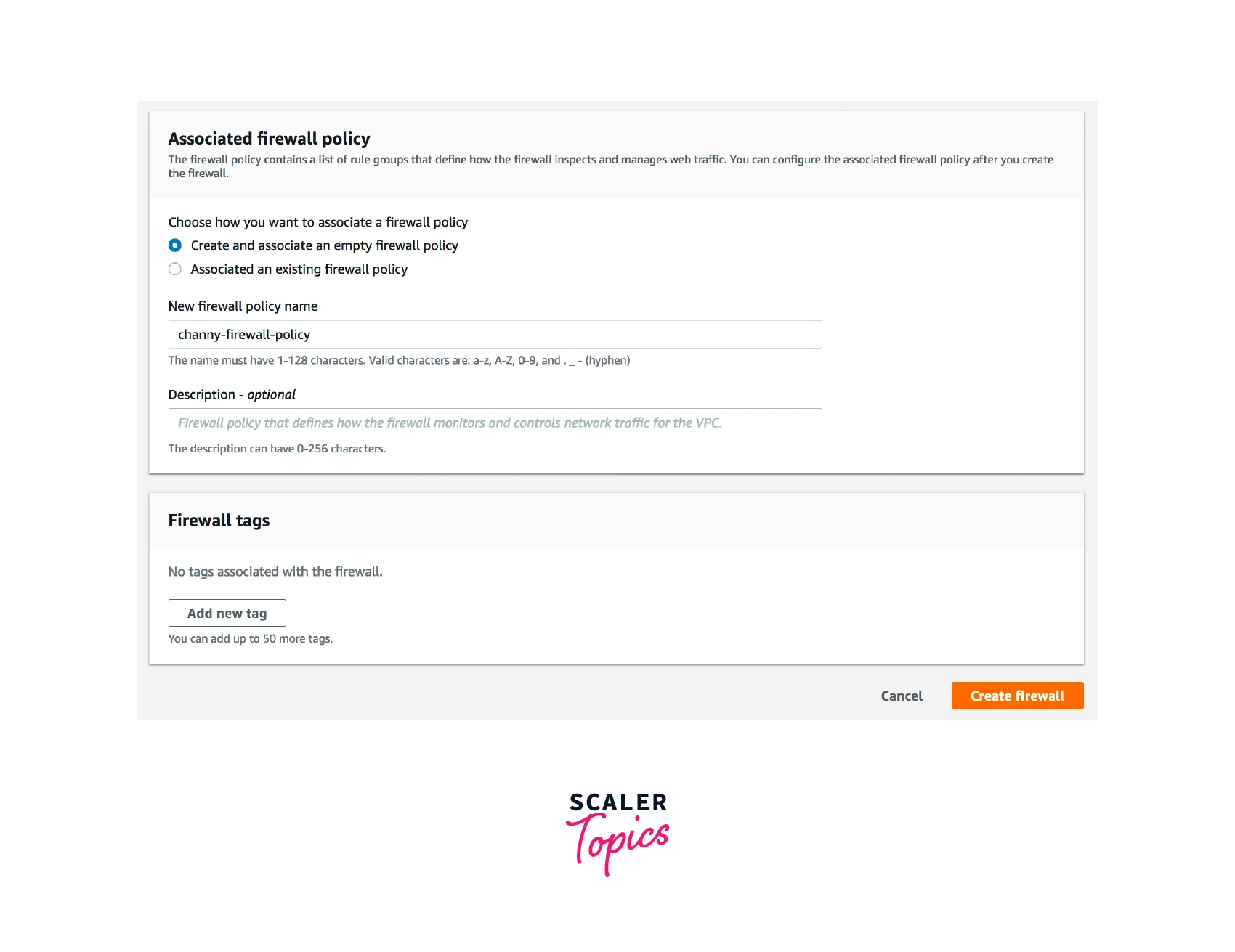Enter the name you'd like to use to refer to this firewall under Name. After you create a firewall, you cannot modify its name.