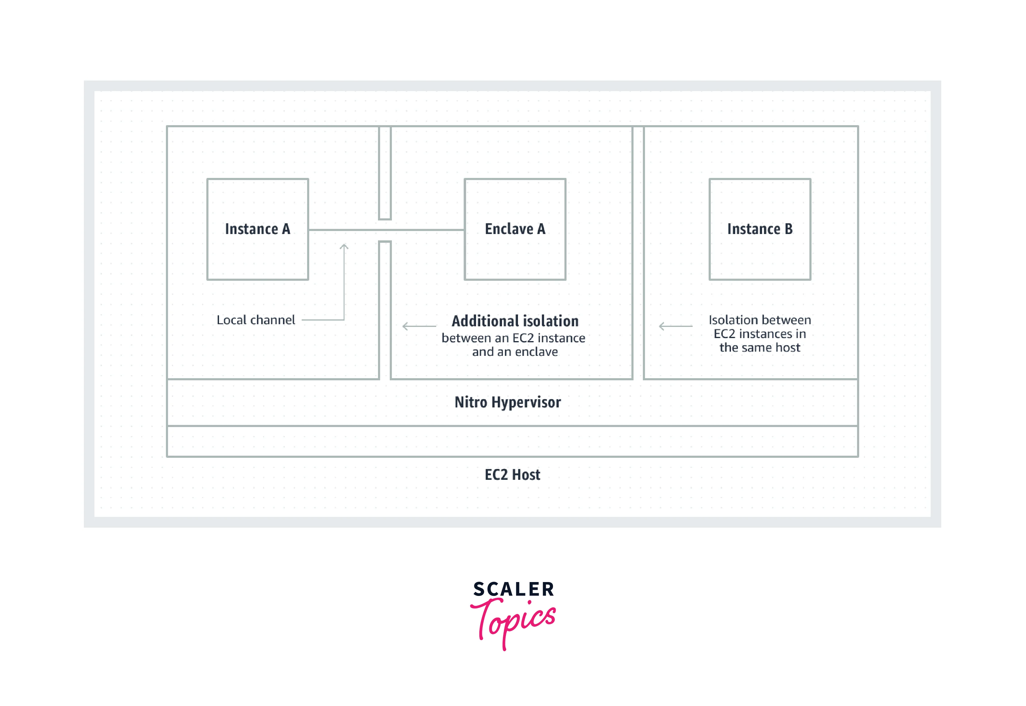 Extra Isolation and Security: Enclaves are totally isolated, fortified, and highly limited virtual computers. They do not have permanent storage, interactive access, or external networking. A secure local channel is used to communicate between your instance and your enclave.