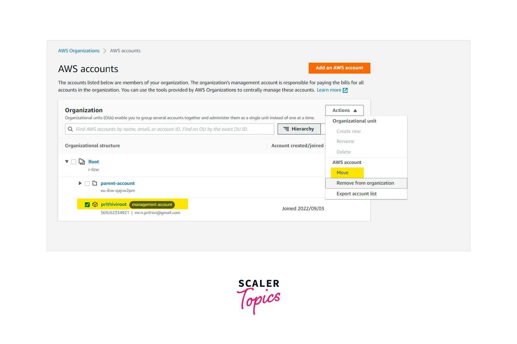- We can create a new organization unit and add or remove the existing AWS member account from the organization unit.