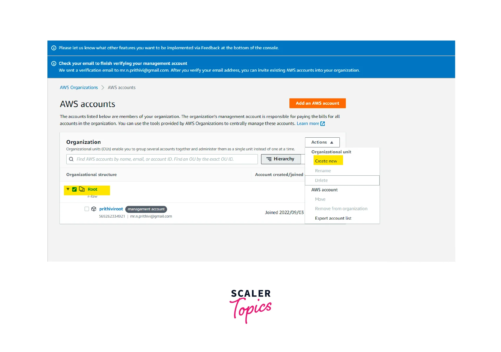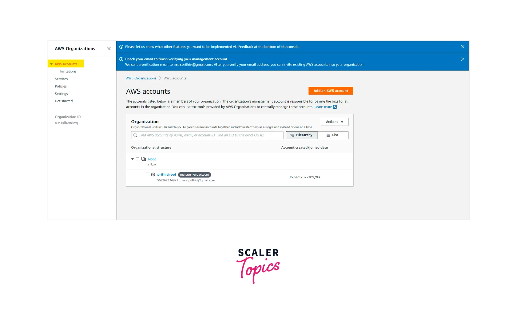 Every account has its own AWS Management Account. Before starting work on the AWS Organization, we need to verify the root user's email address for the AWS Management Account.