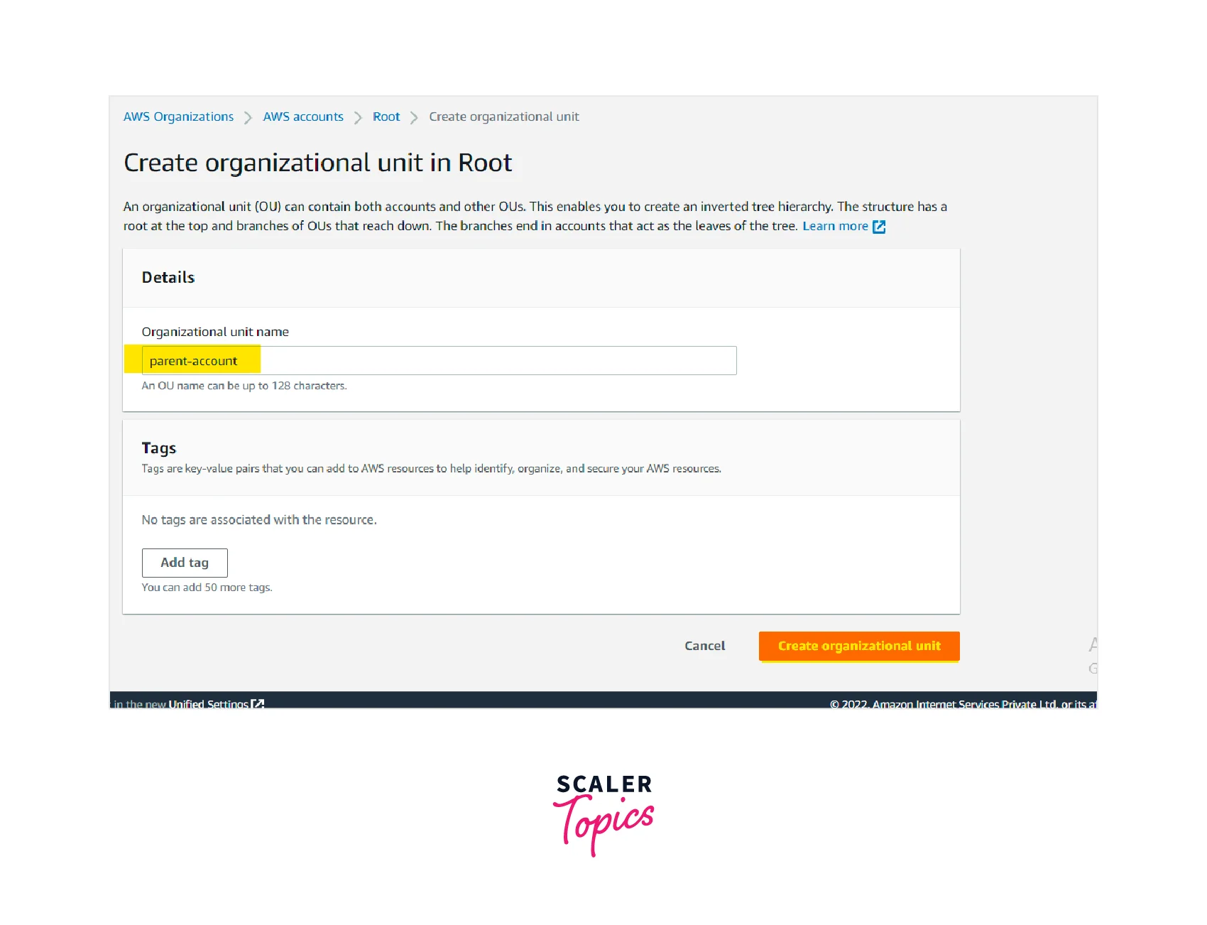 Click Create new under the organization unit heading and enter the organization unit name.Organization Unit Name : parent-account