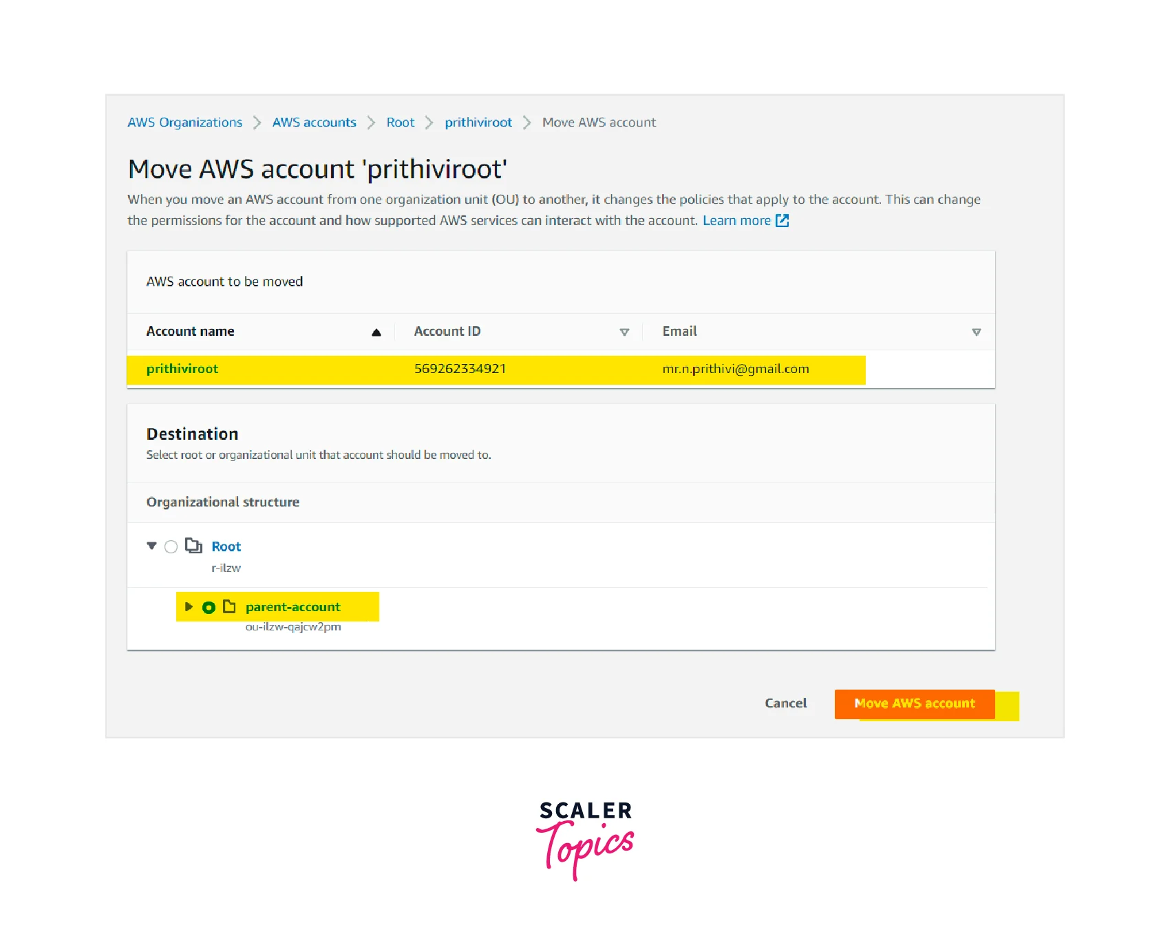 Select the checkbox of the newly created organizational unit and click the Move AWS account button.
