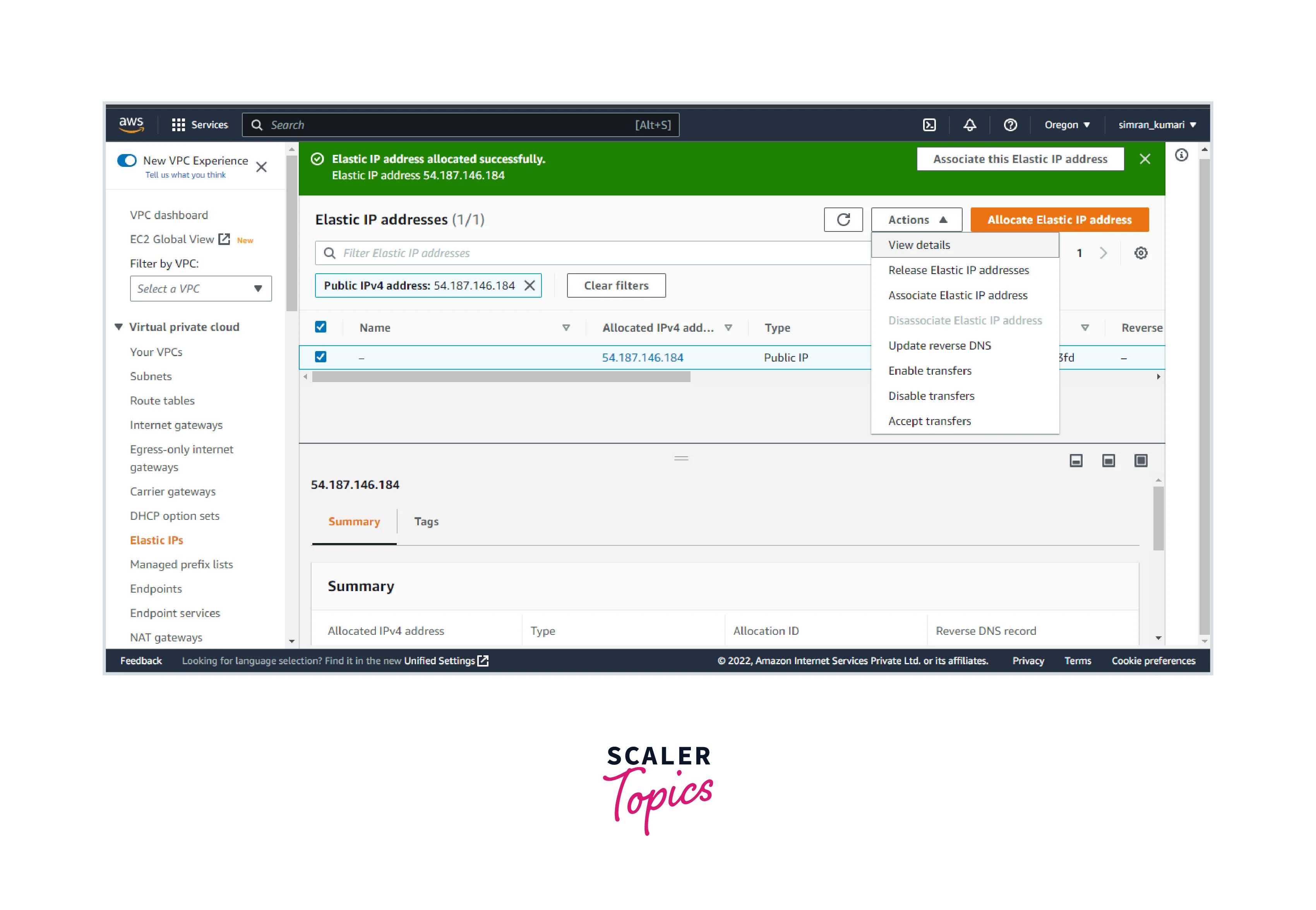 - Select this Elastic IP address and click on Actions. Click on View Details.