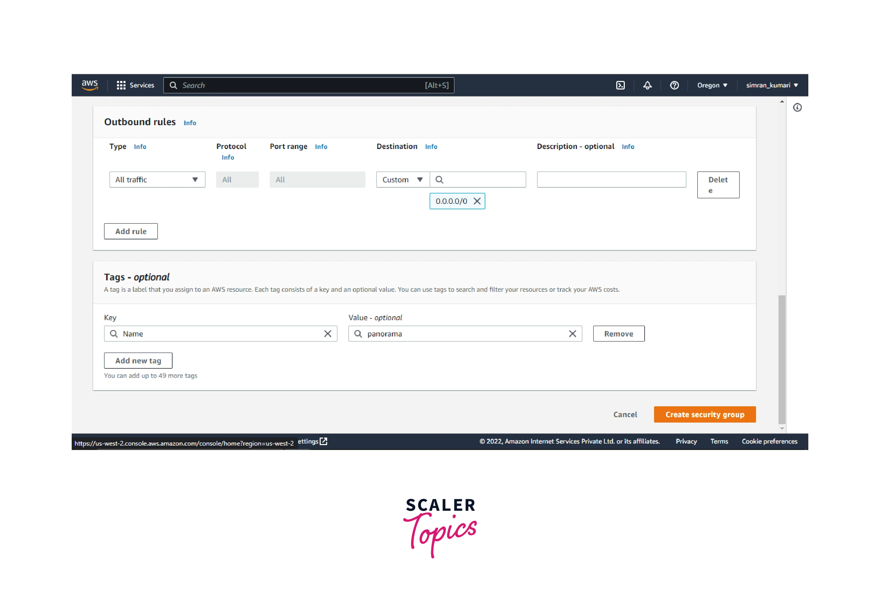 - Click on Add new tag and provide a name tag. Click on Create security group.