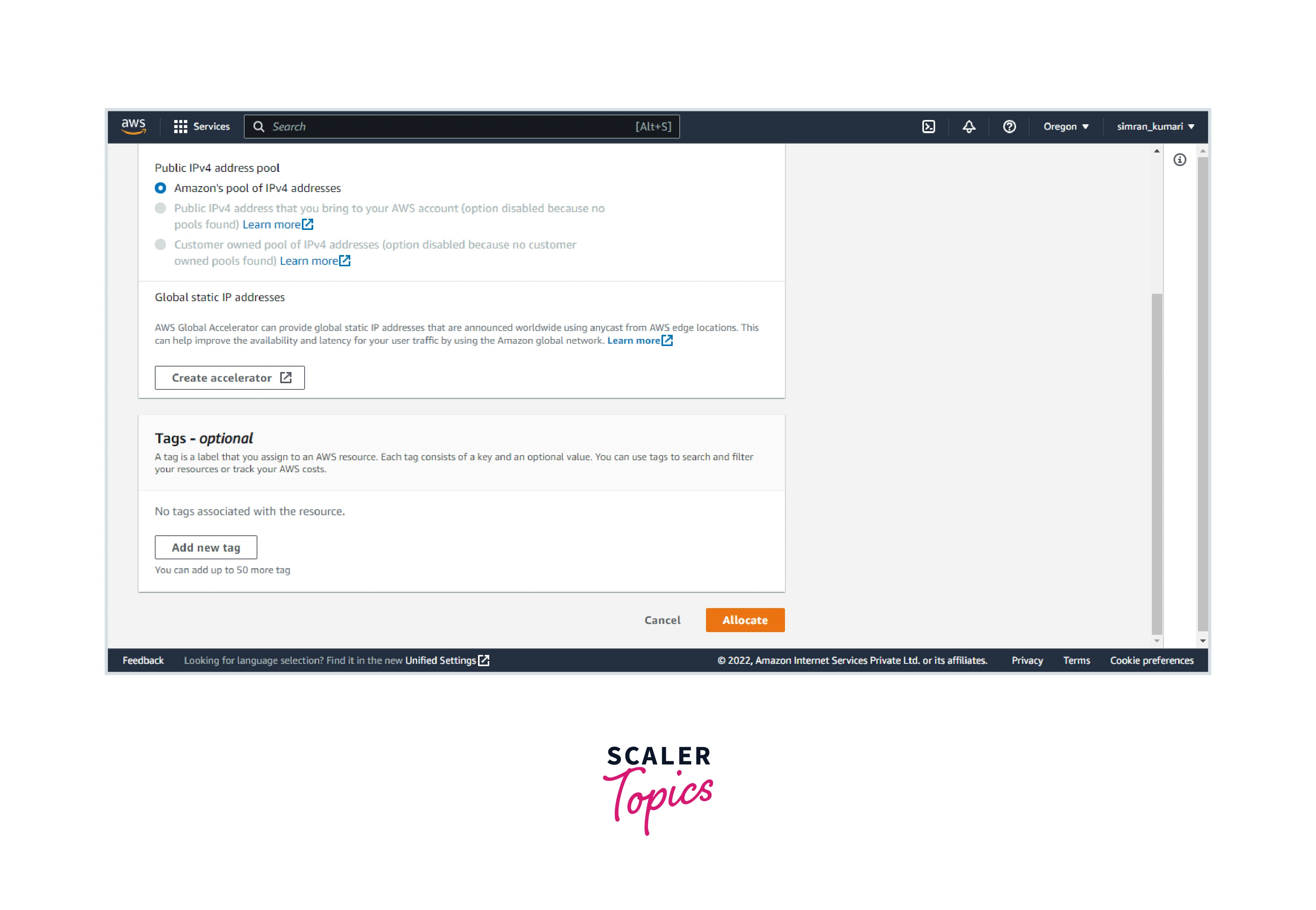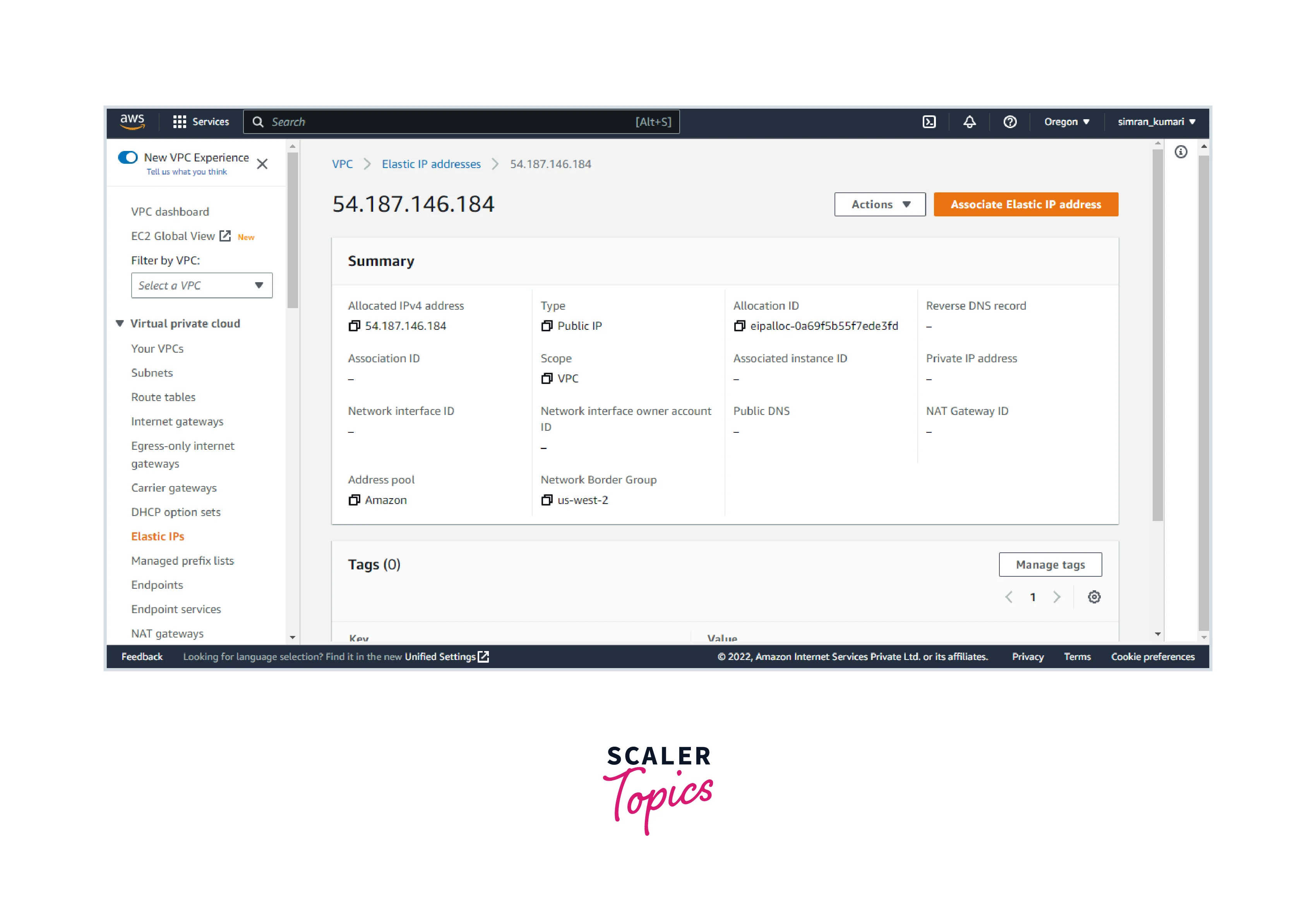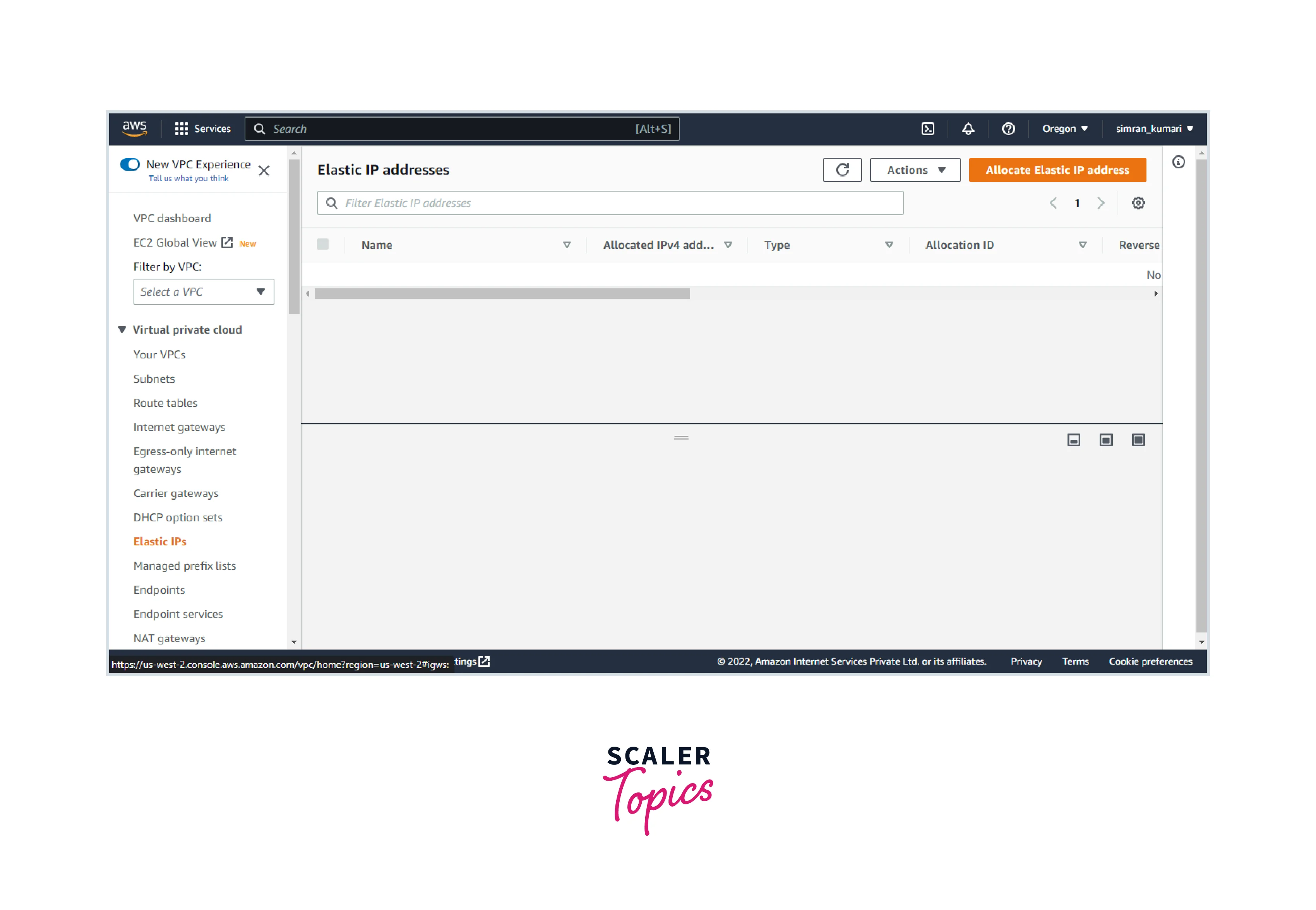 - Go to the Elastic IPs in the VPC console. Click on Allocate Elastic IP address.