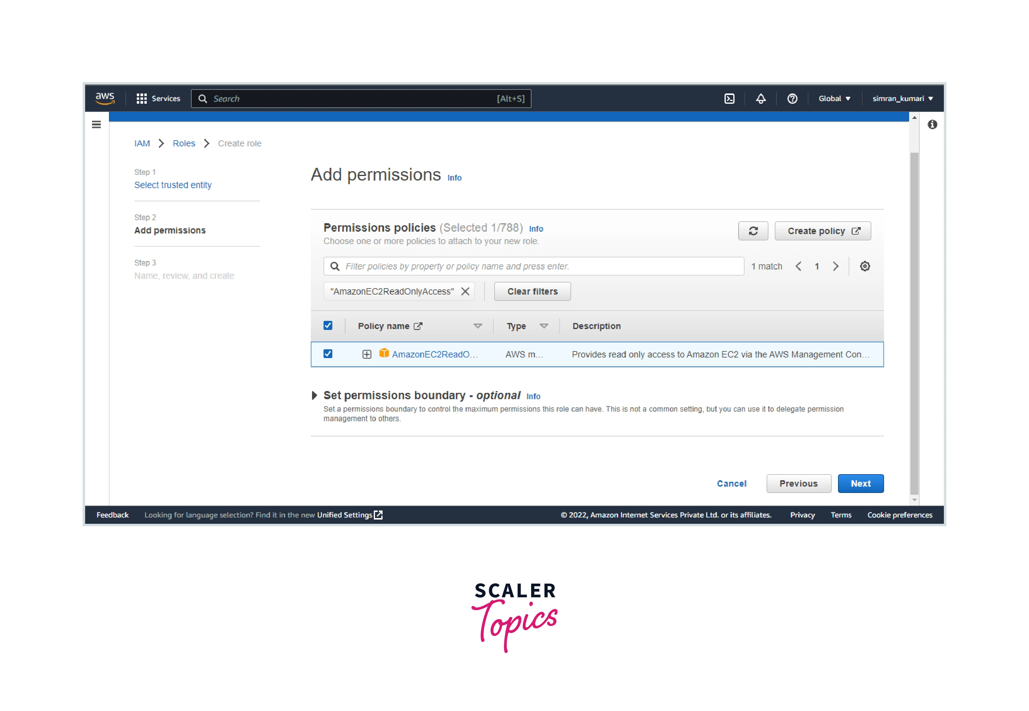 In the permissions, choose the AmazonEC2readonly access and click on Next.