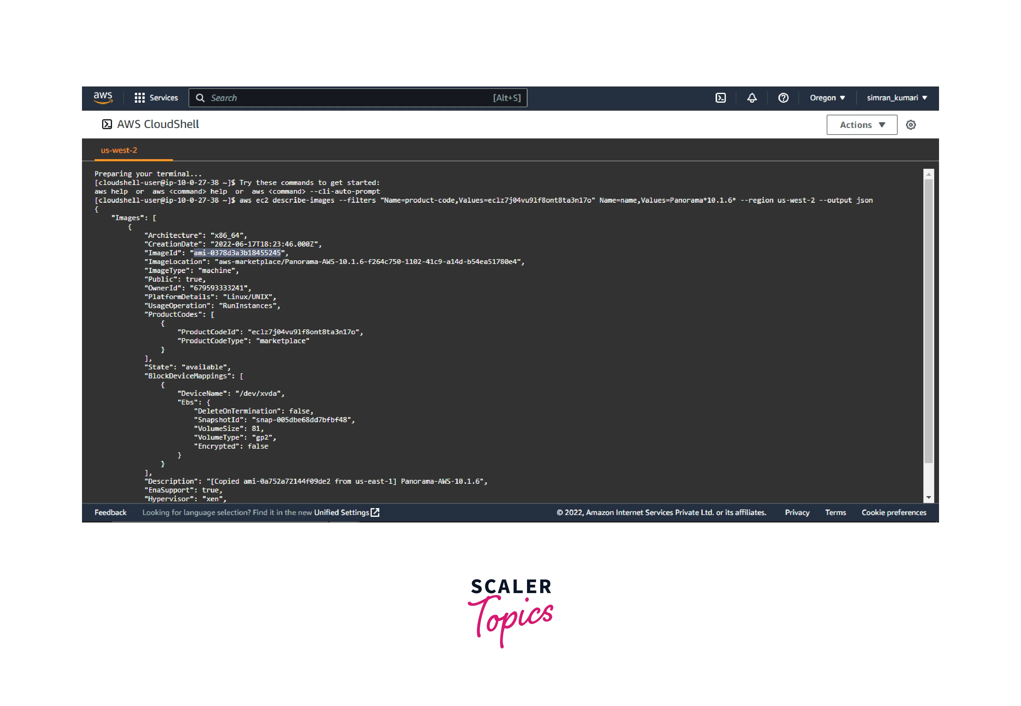 - aws ec2 describe-images --filters "Name=product-code,Values=eclz7j04vu9lf8ont8ta3n17o" Name=name,Values=Panorama*10.1.6* --region us-west-2 --output json Run this command to get the image ID. Copy this image ID.