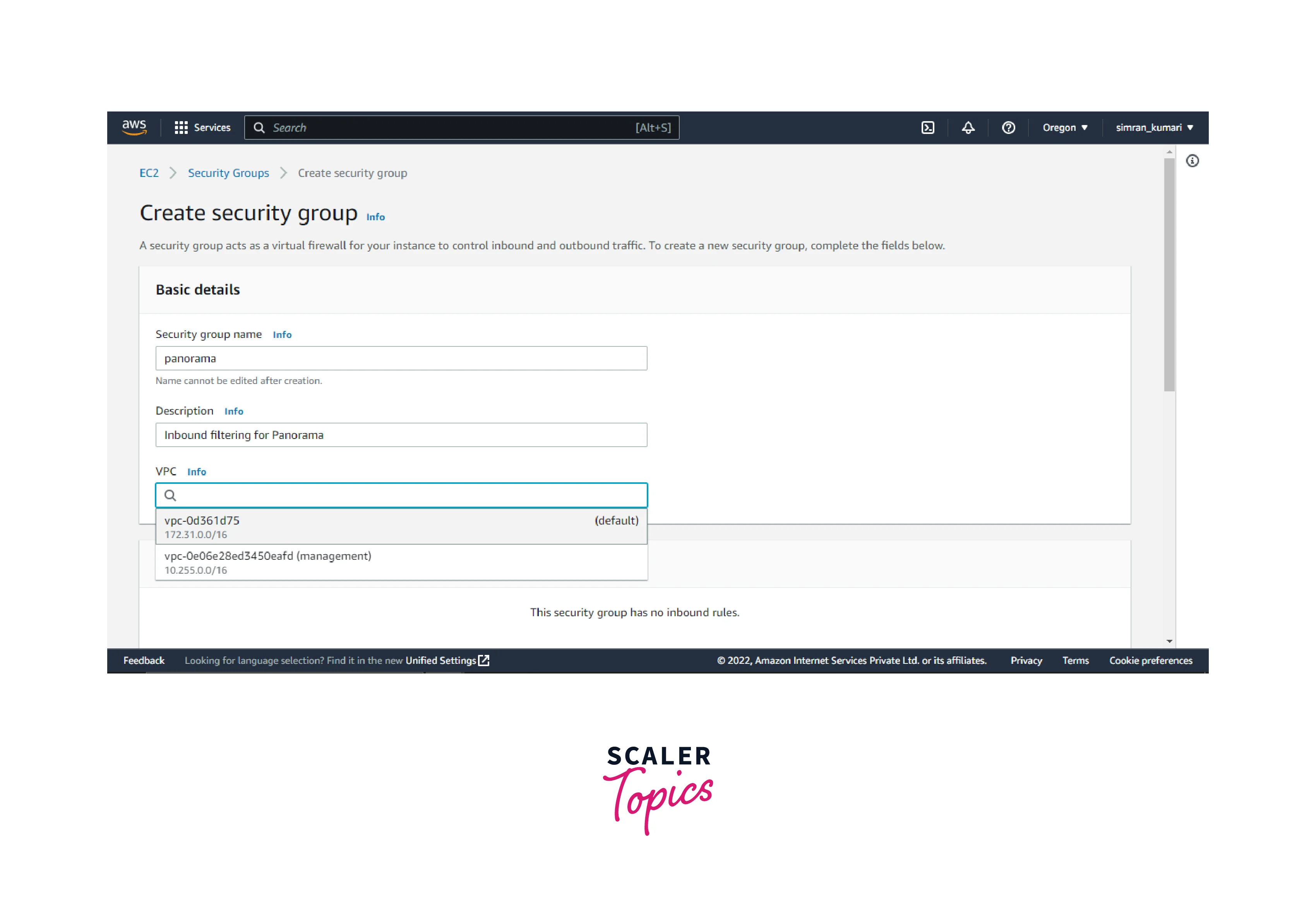 - Provide a name to the security group and a description, and choose the VPC.
