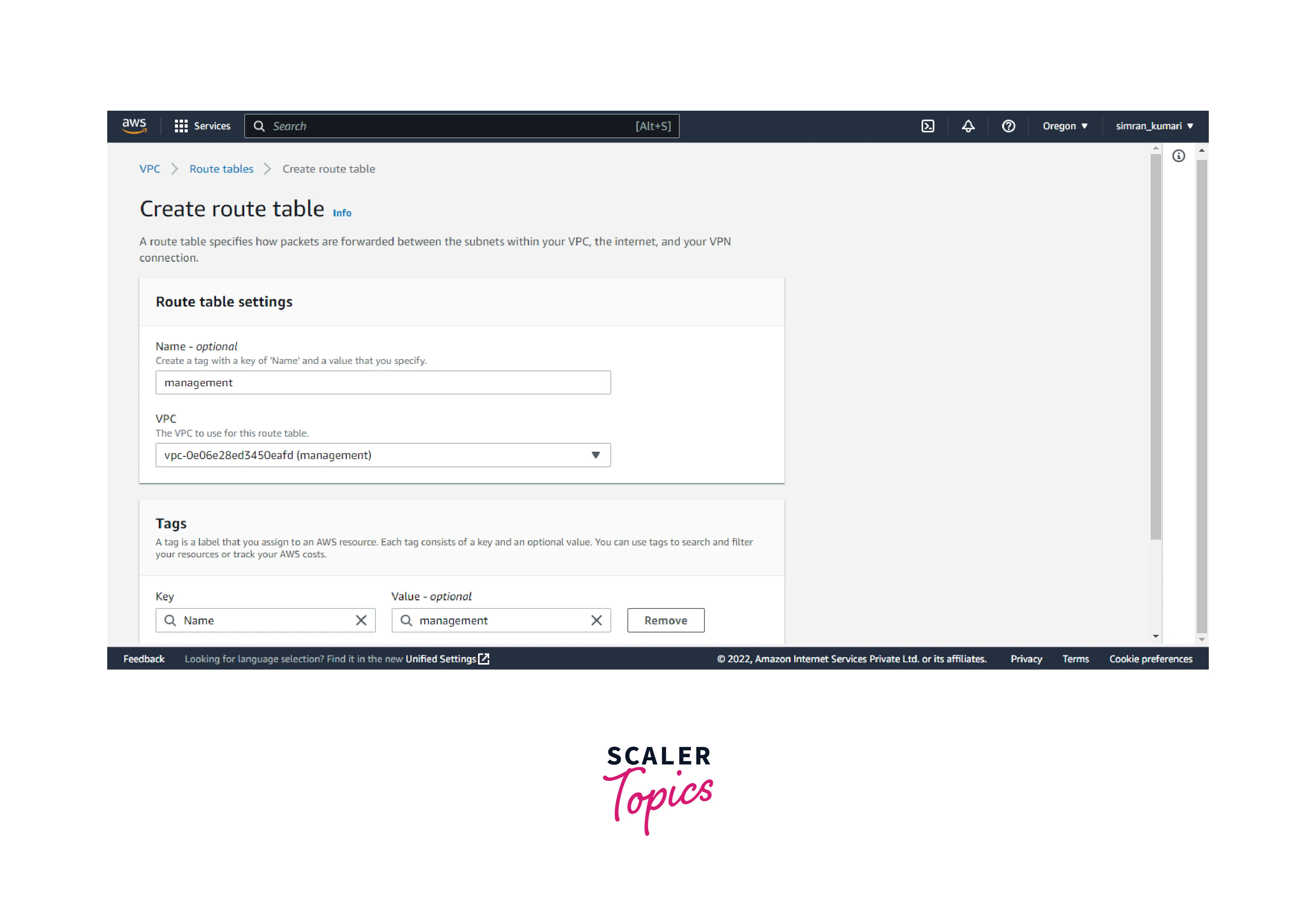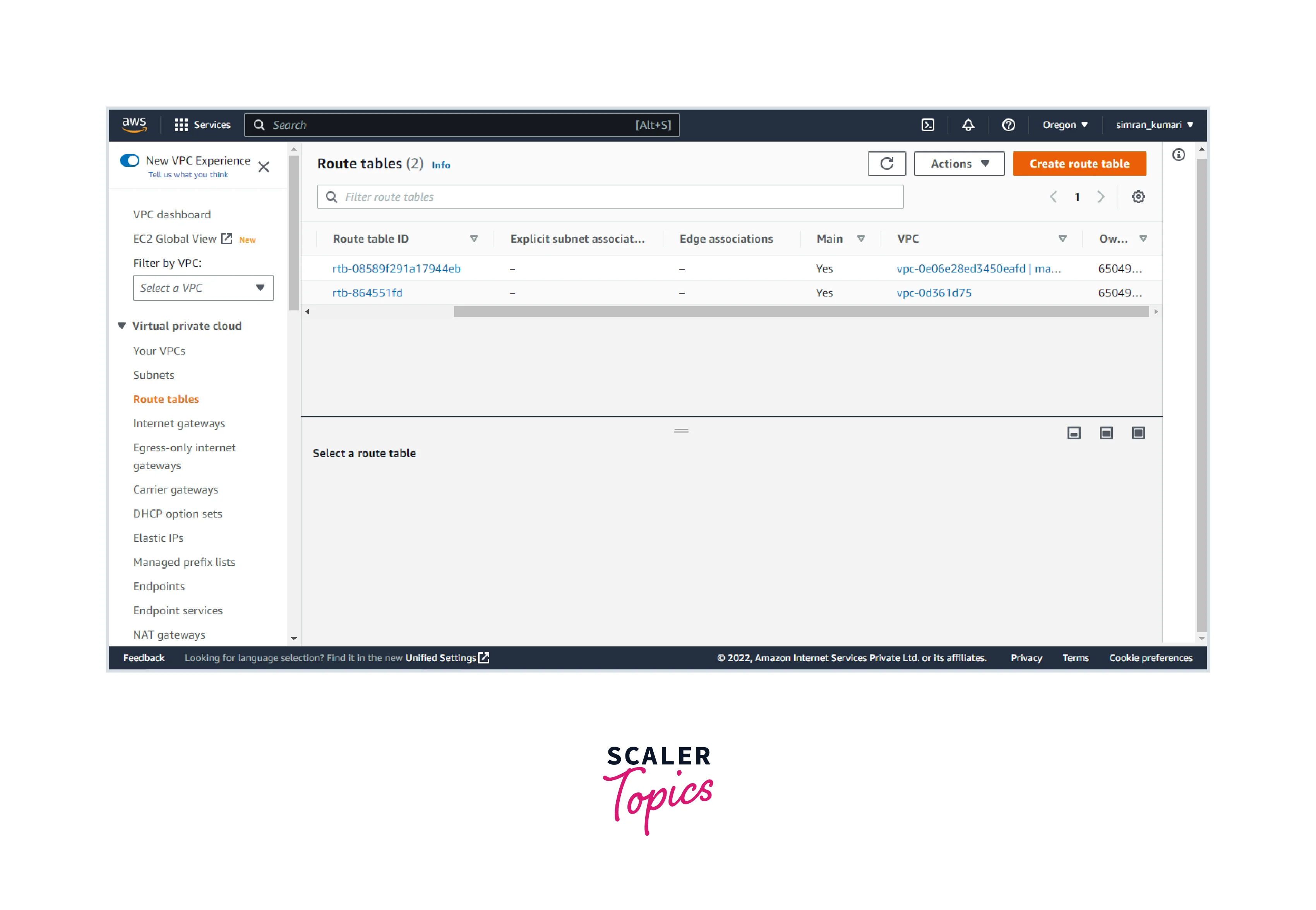 - Fill in the name of the routing table and choose the VPC. Scroll and click on Create route table.