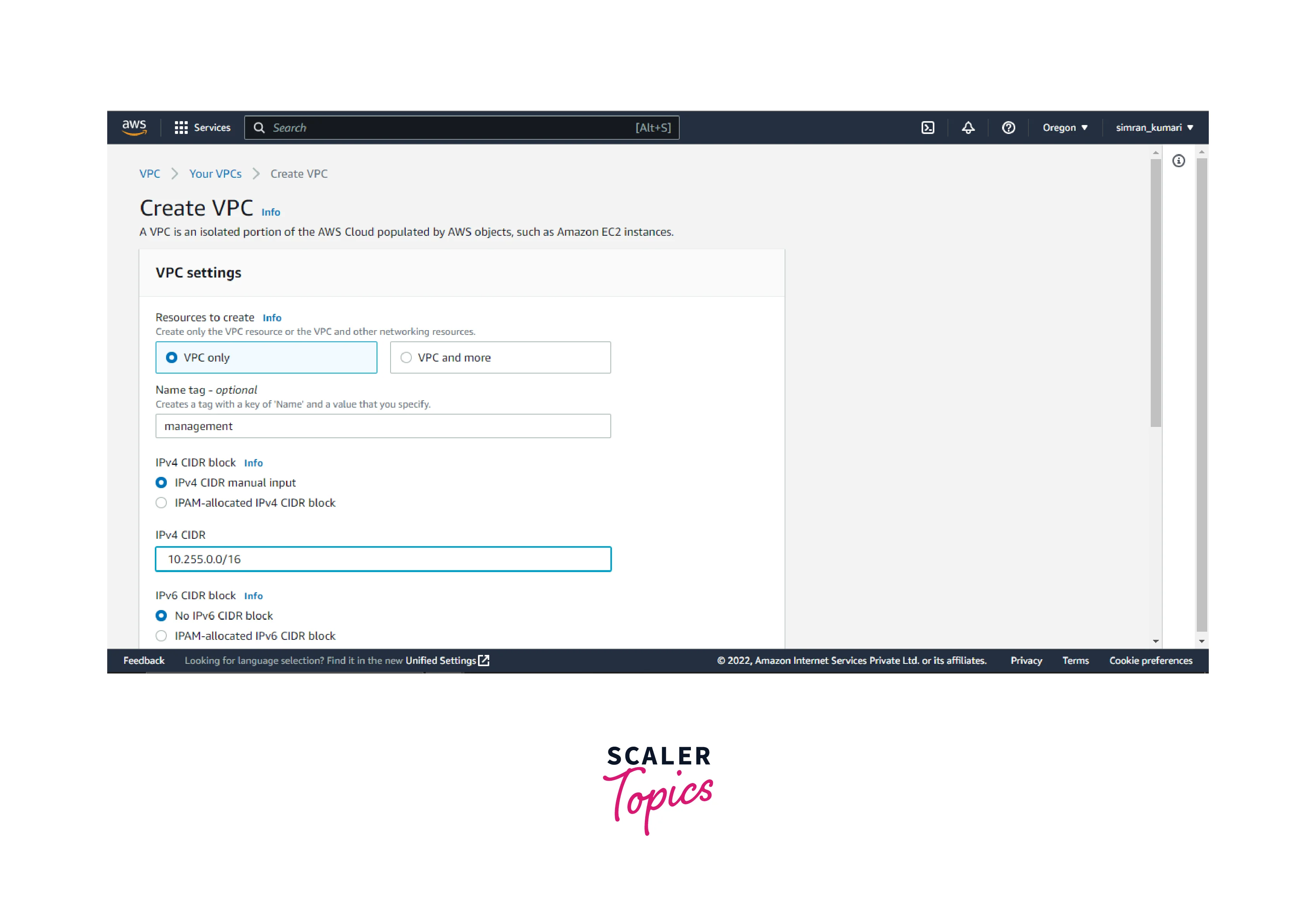 - Choose VPC only, fill in the name of the VPC, and provide the IPv4 CIDR block. Scroll and click on Create VPC.