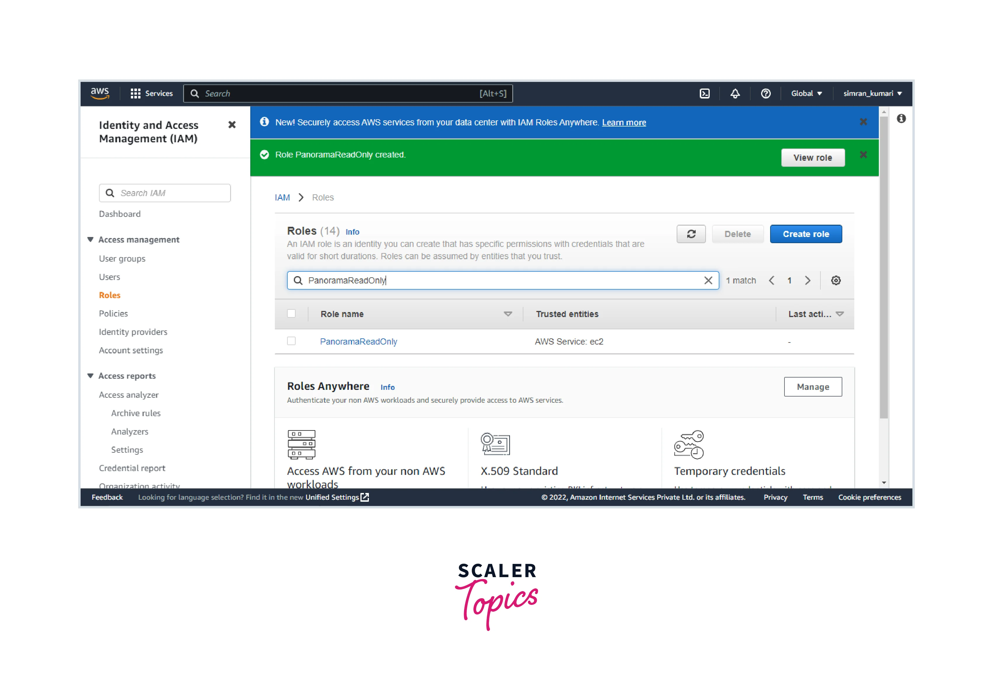 The IAM role is created successfully.