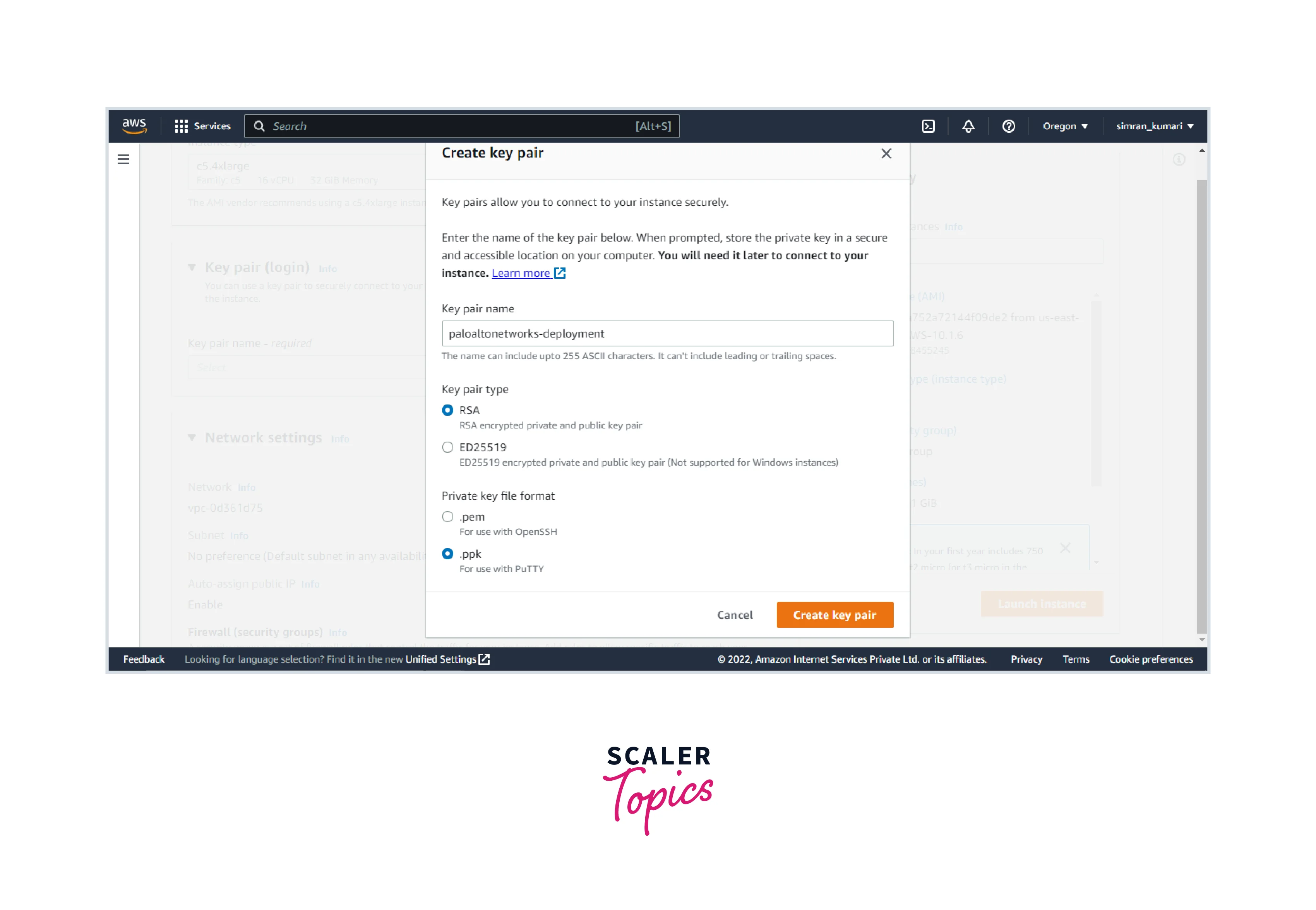 - Fill name for the key pair and choose the file format as ppk. Click on Create key pair. It will create a key pair and save it to your machine.