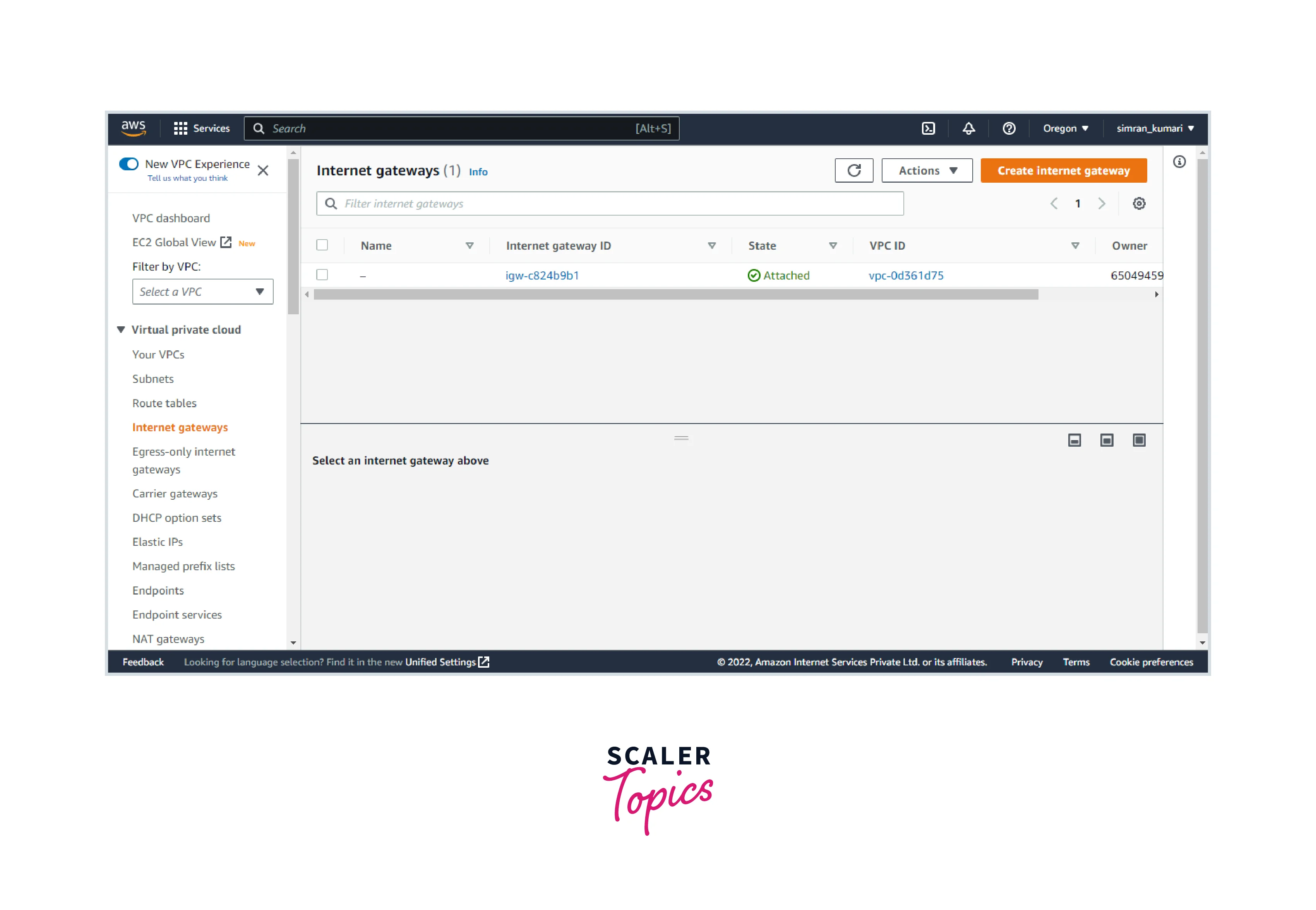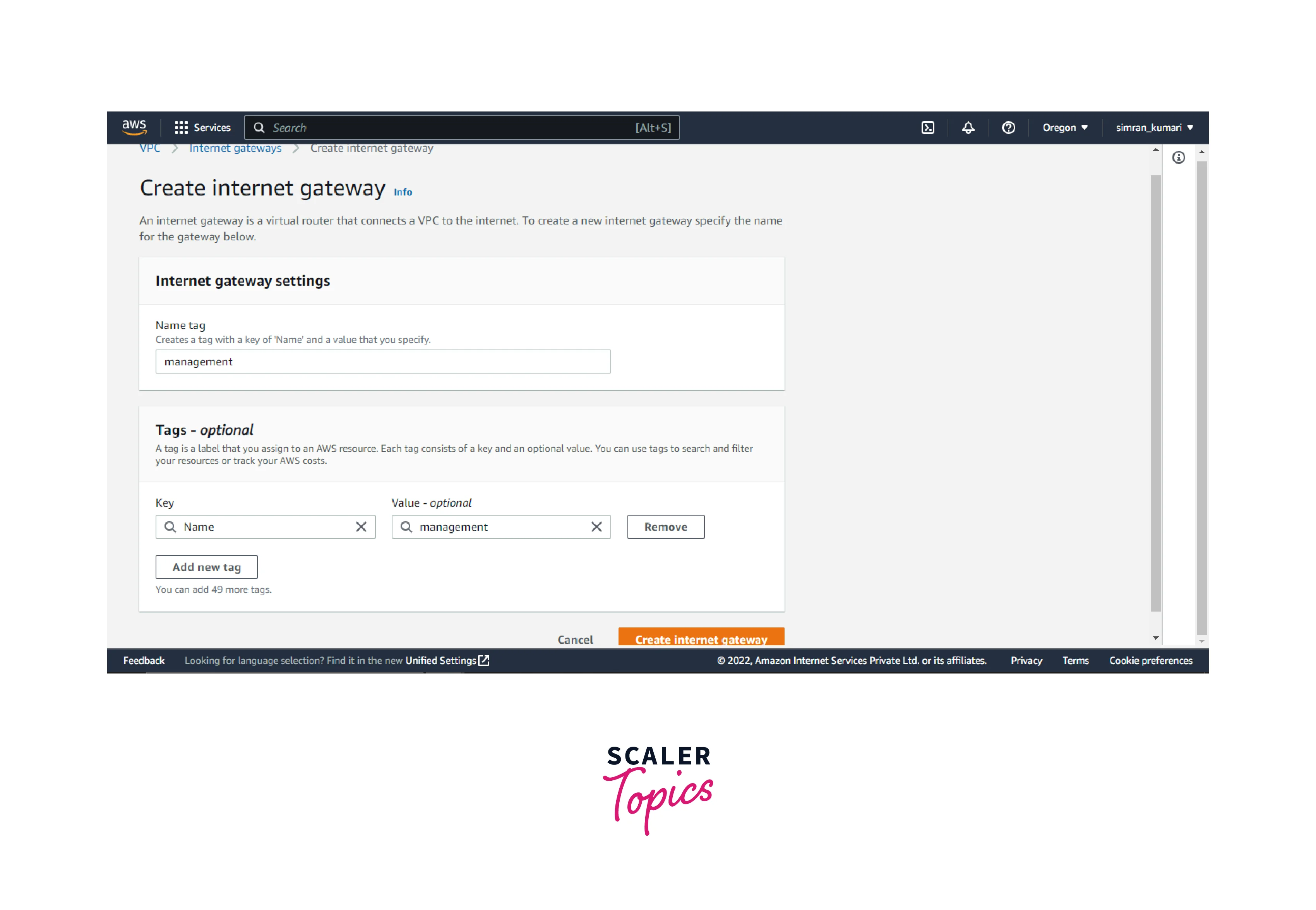 - Provide a name to the internet gateway and click on Create internet gateway.