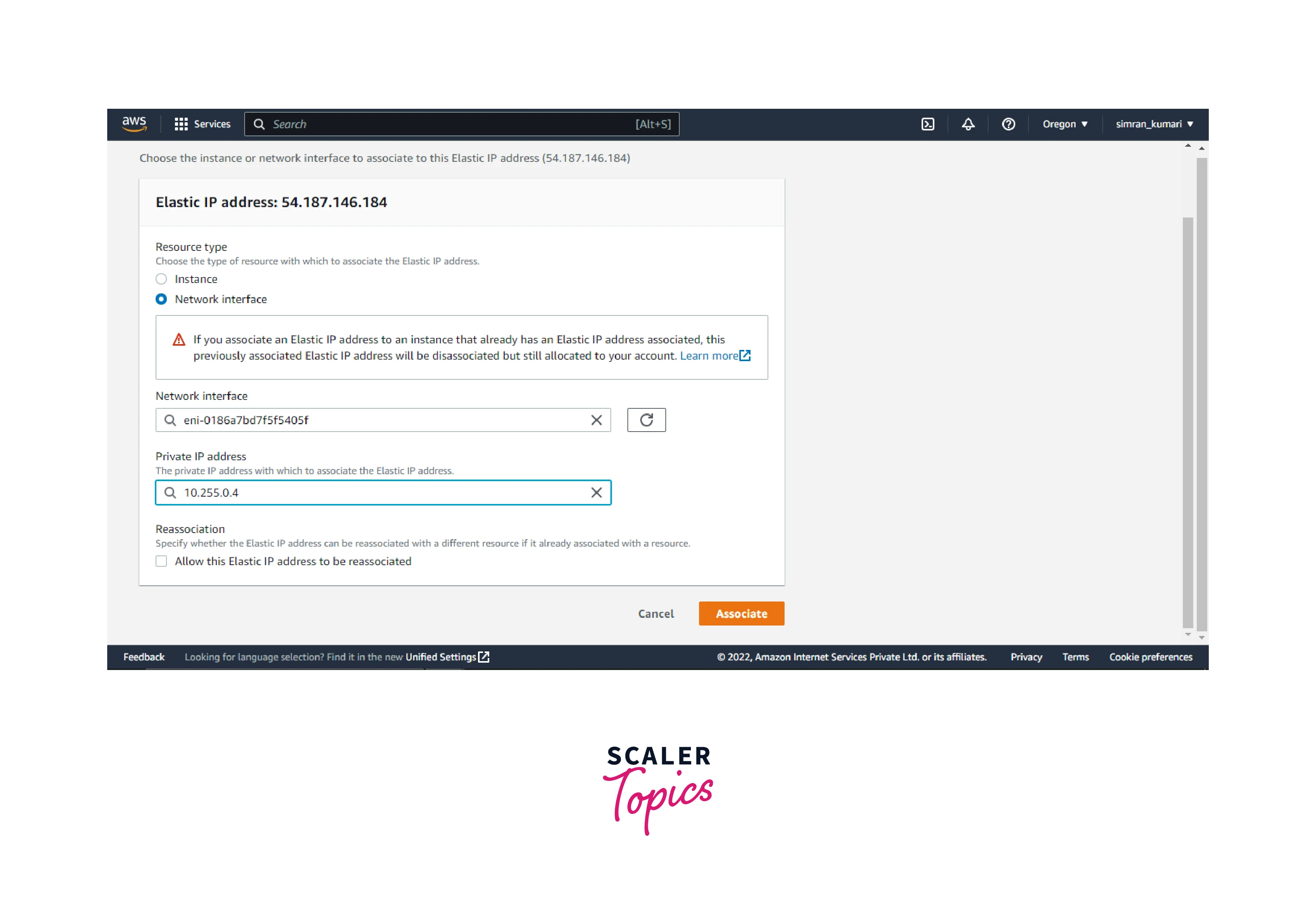 - Choose the network interface and select the network interface and IP address. Click on Associate.