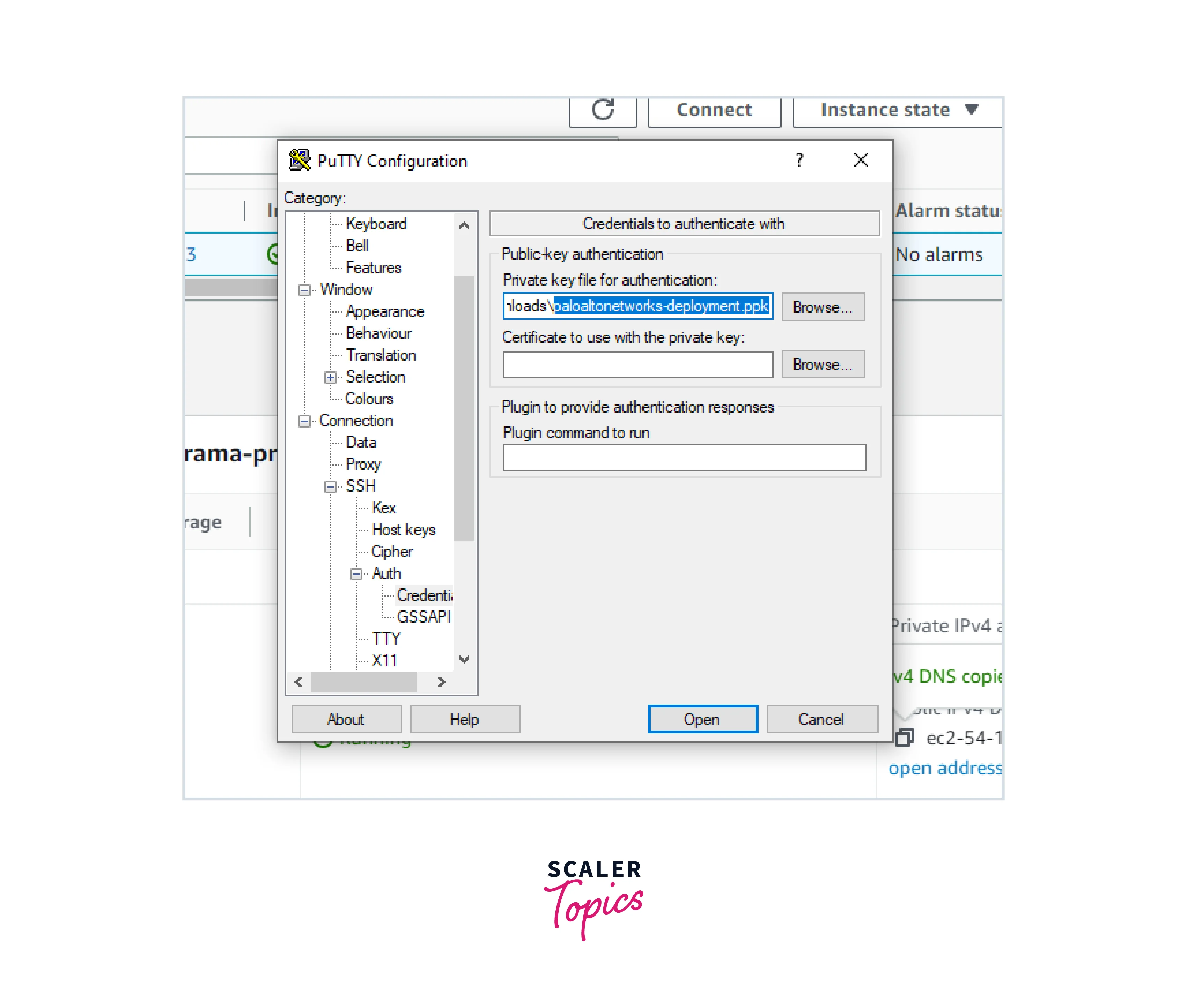 - Select the ppk file from the local machine and click on Open.