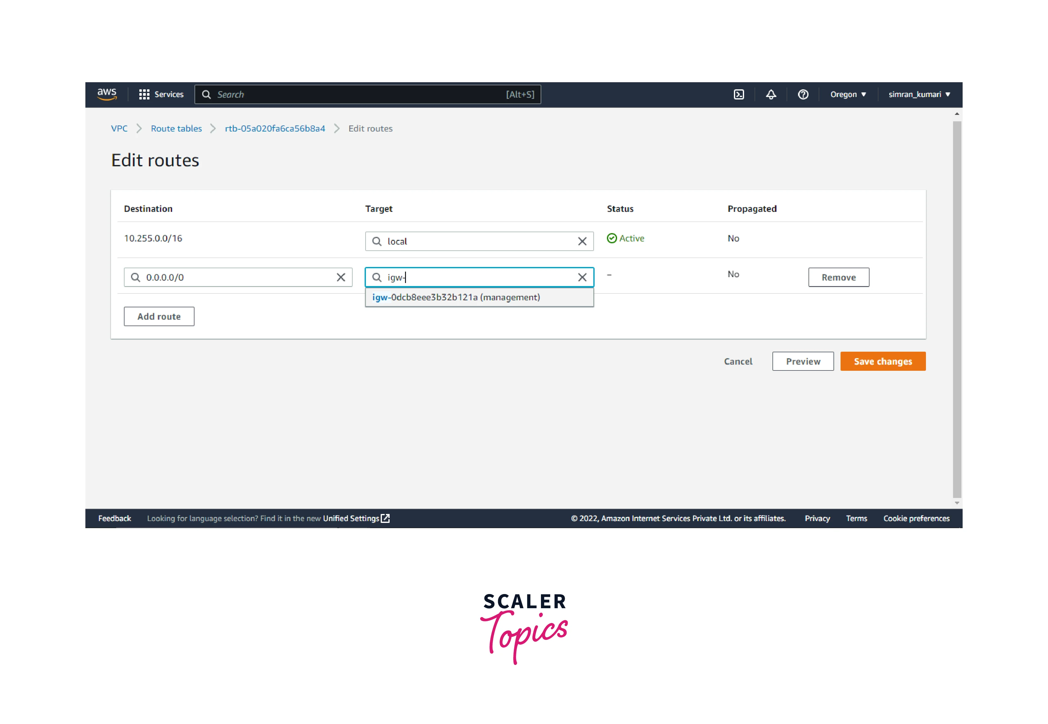 - Click on Add route. Enter 0.0.0.0/0 in the destination box and choose the created internet gateway in the target box. Click on Save changes.
