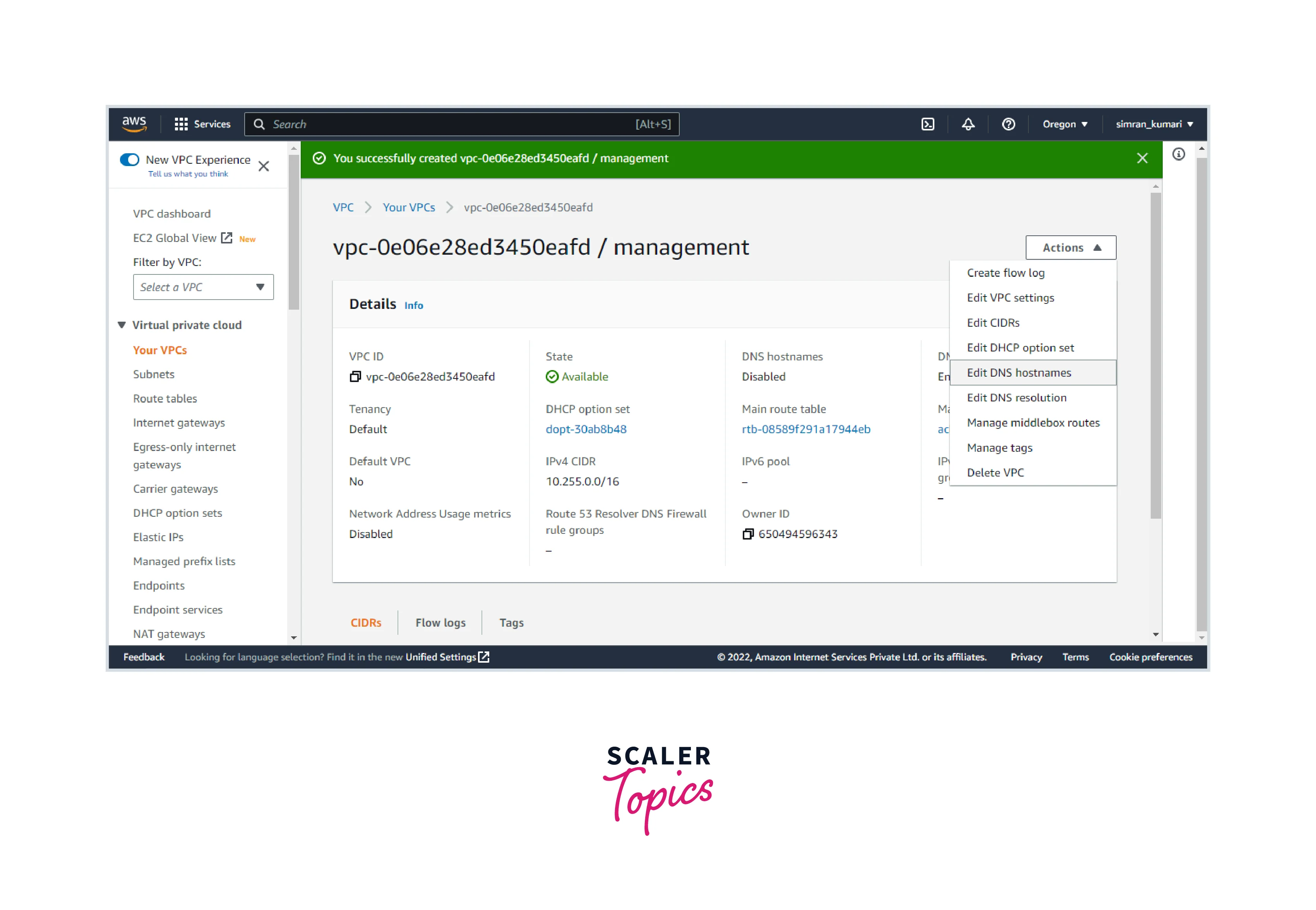 - VPC is successfully created. Go to the Actions and click on Edit DNS hostnames.