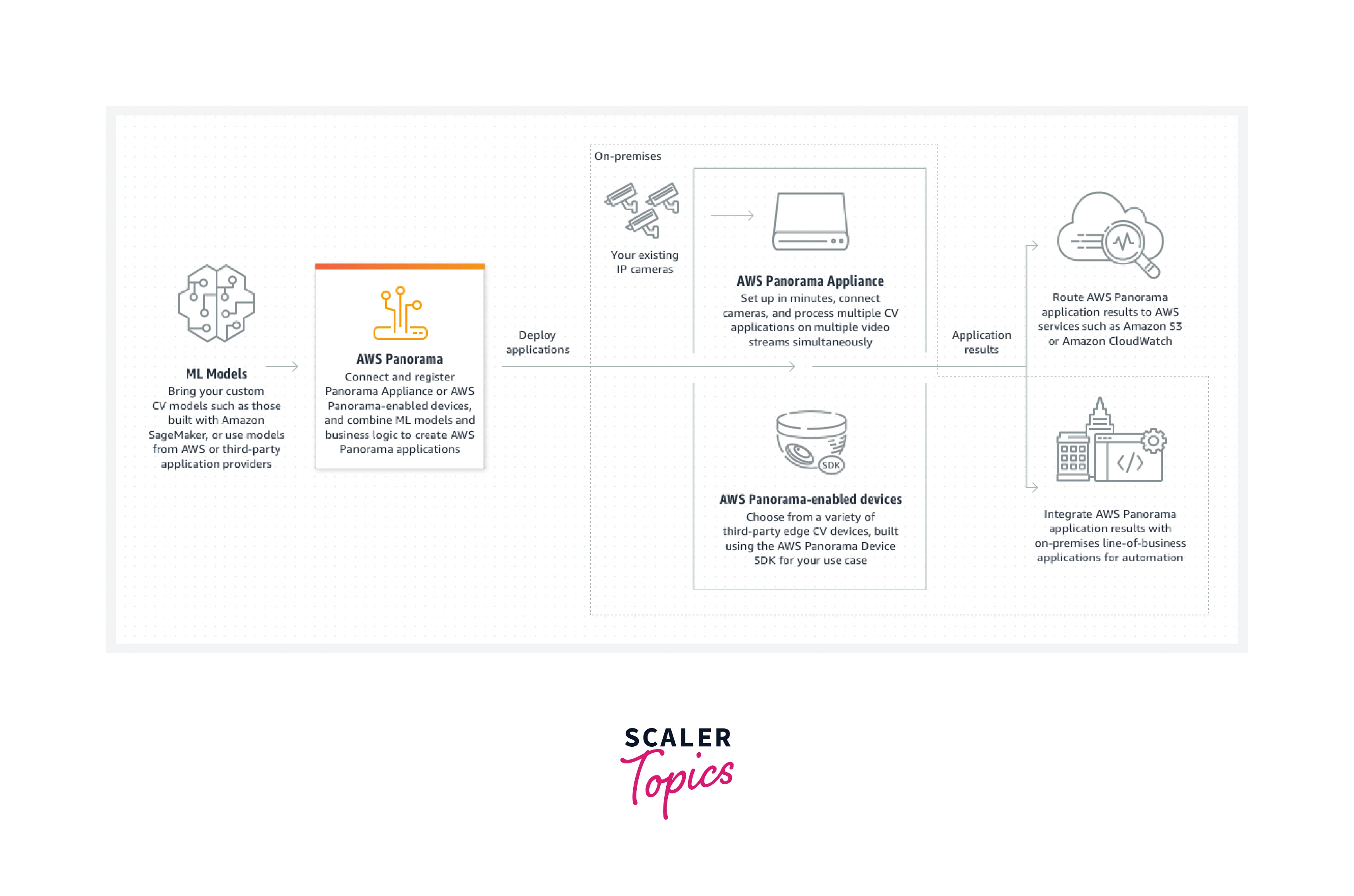 - Not only this, AWS Panorama can integrate the above two features, i.e., It can run multiple machine learning models on top of multiple connected devices in parallel.