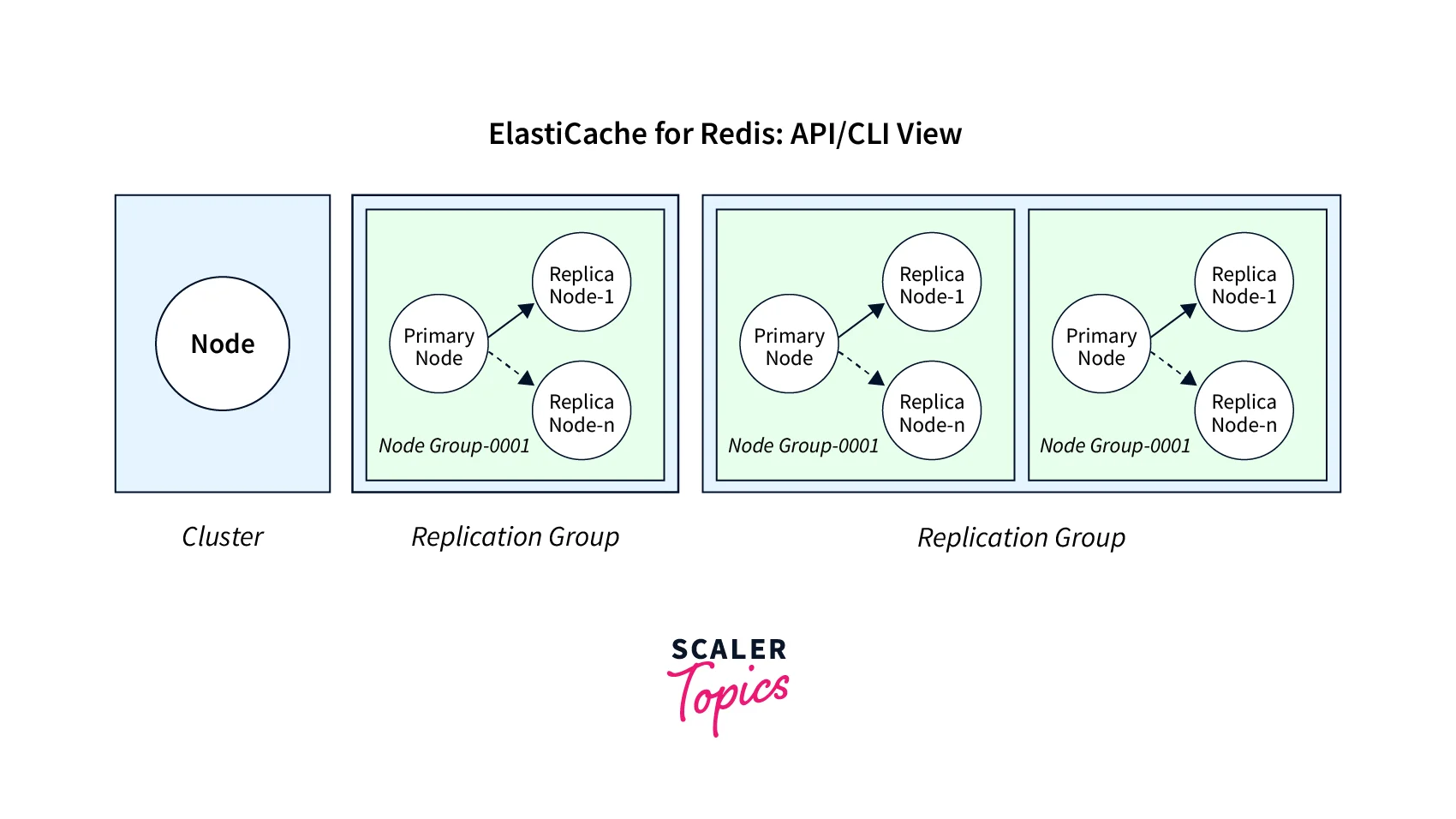 The ElastiCache API and AWS CLI actions continue to differentiate between single-node ElastiCache for Redis clusters and multi-node replication groups. The graphic below depicts the different ElastiCache for Redis topologies as seen using the ElastiCache API and AWS CLI.