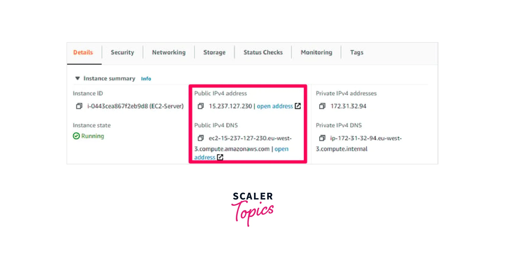 When the EC2 instance has started running, go to its information and get the "Public IPv4" address as shown below, which will be used afterward to access the site.