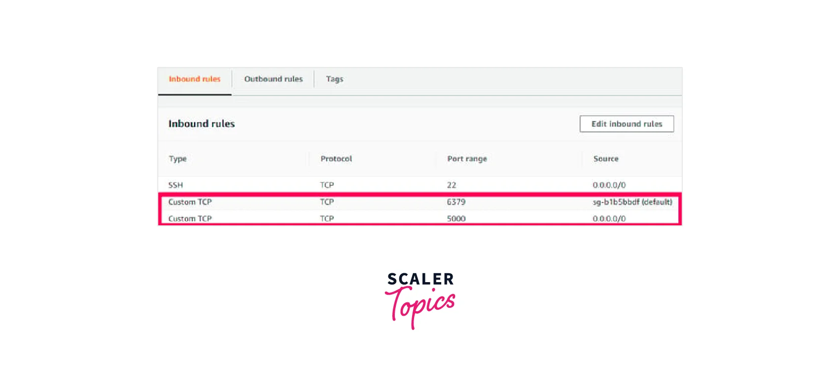 The security group assigned to the EC2 instance should permit two custom TCP inbound rules: one for the Redis port range 6379 and a second for the application on the TCP port range 5000.