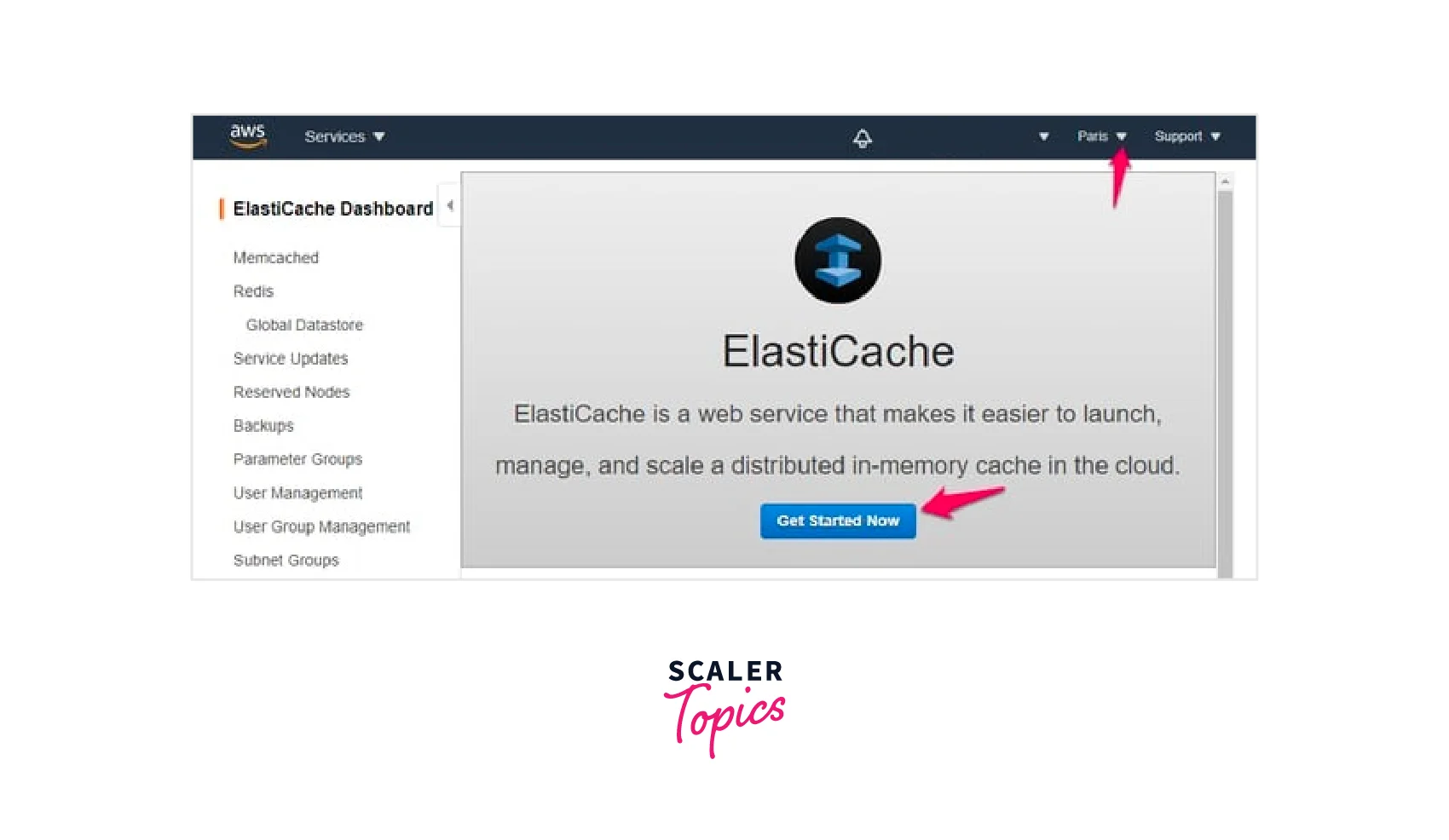 - Click the "Get Started Now" button as shown below. Use the same AWS Region as the EC2 instance for the Redis cluster, as shown in the upper right corner.