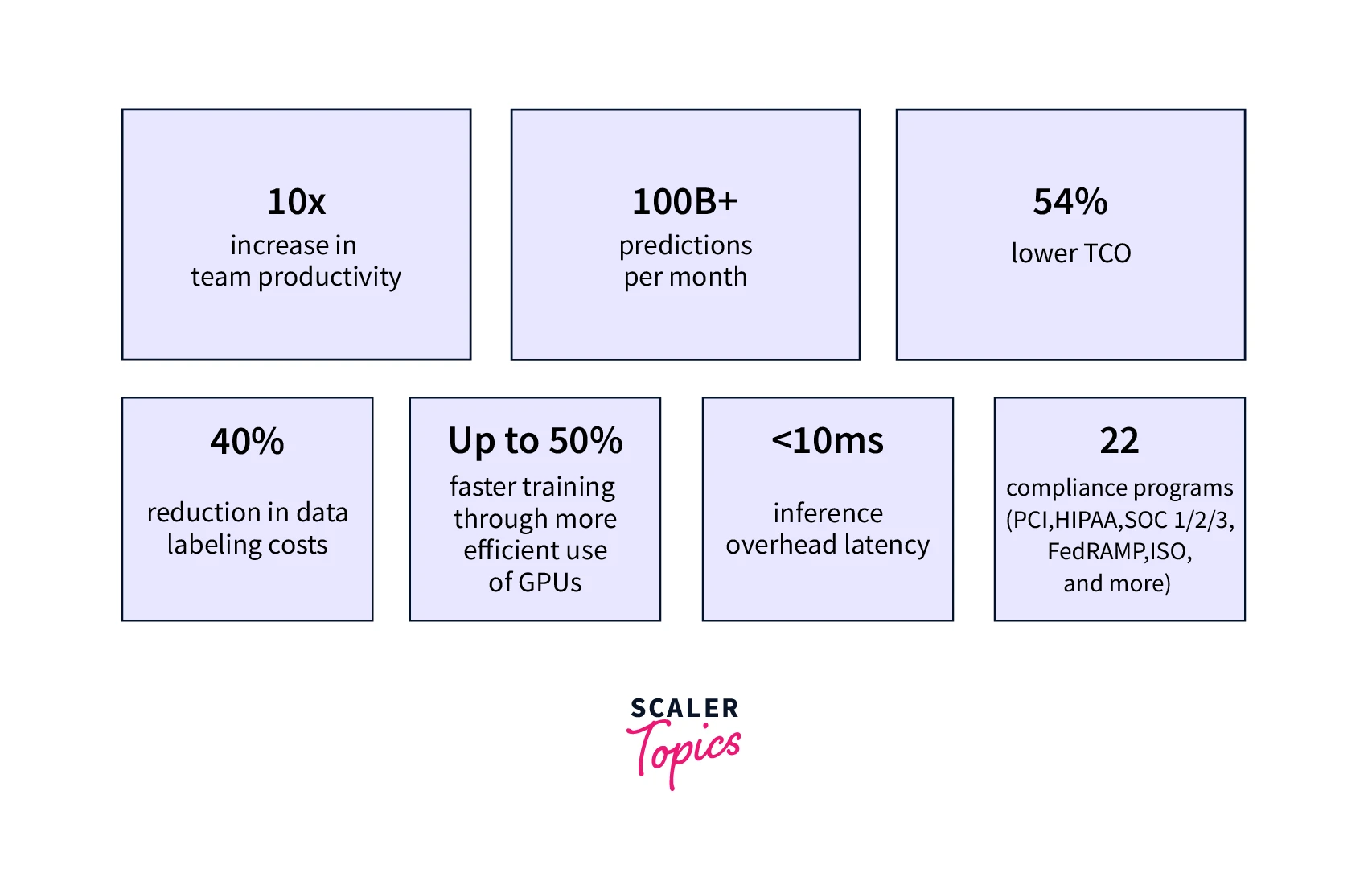 - With AWS Sagemaker your training time is reduced (from hours to minutes) with its optimized infrastructure. This helps to boost team productivity up to 10 times with purpose-built tools.