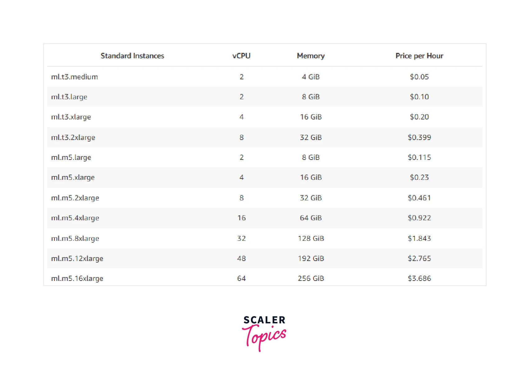 | Studio notebooks, and notebook instances | 250 hours of ml.t3.medium instance on Studio notebooks OR ml.t3.medium instance on notebook instances OR 250 hours of ml.t2 medium instance |