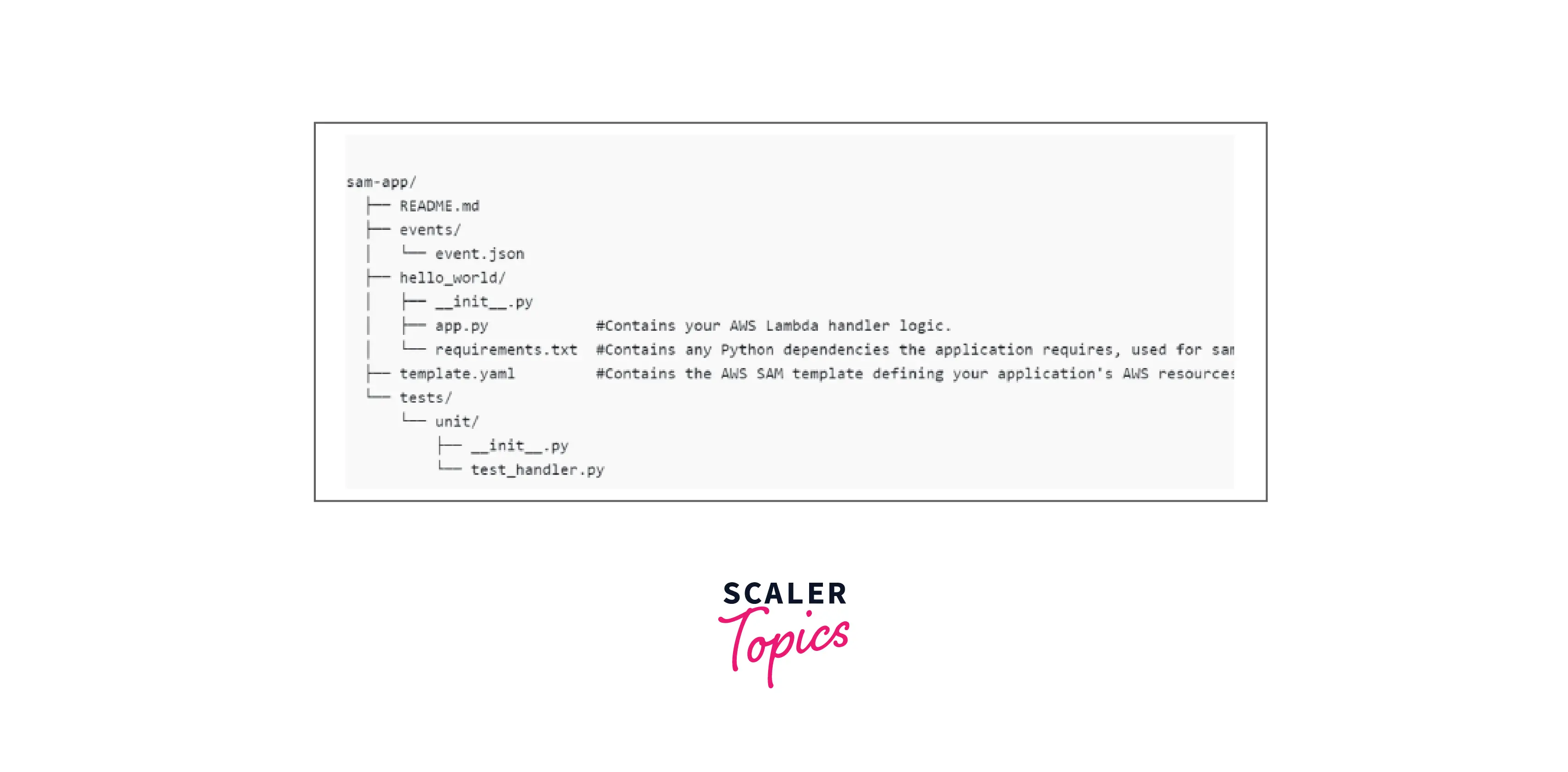 SAM will create a directory and produce code based on your chosen runtime and a template.yaml file. Here's an illustration: