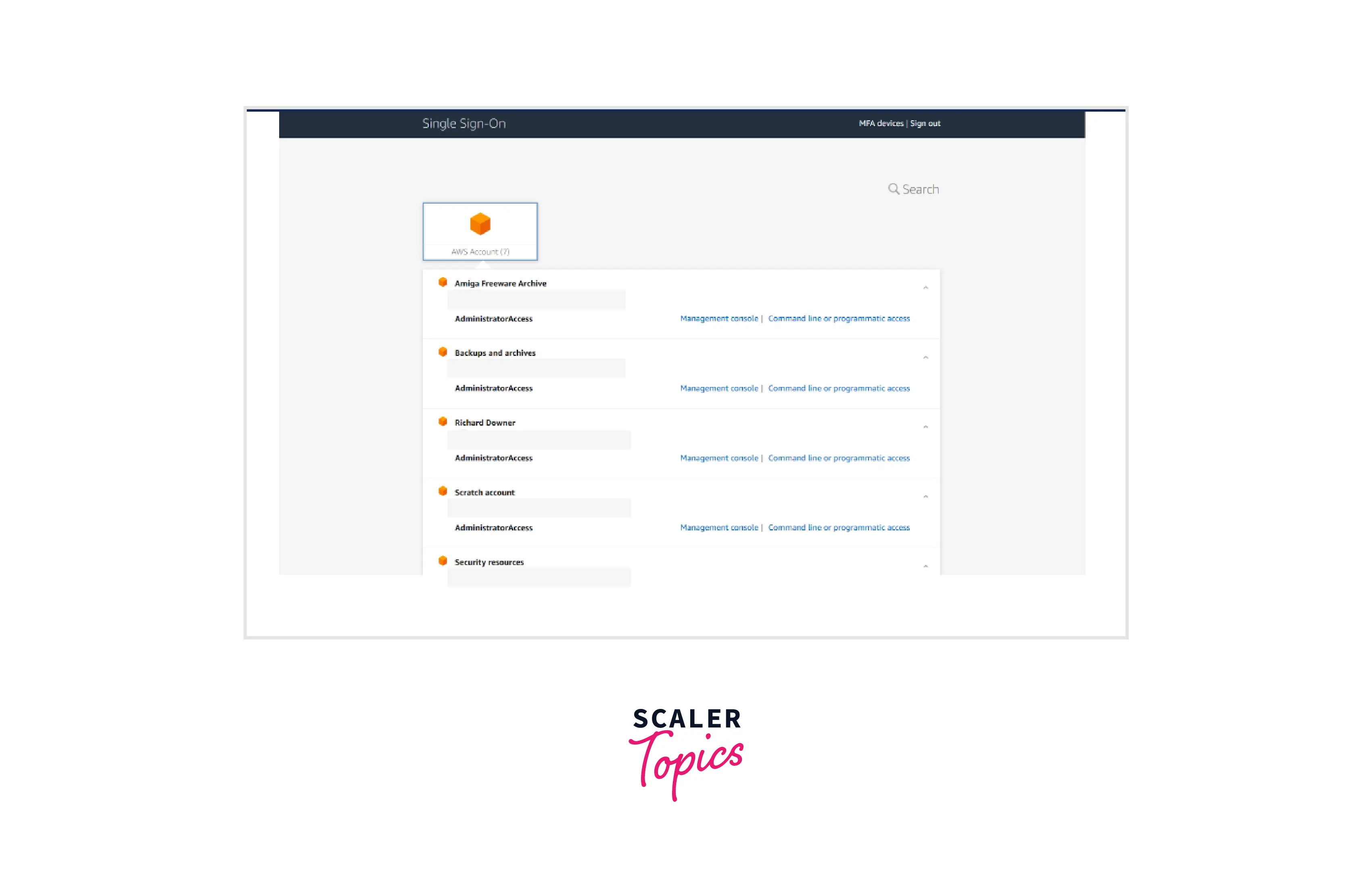 This page contains a list of all AWS accounts in my company, along with links to visit the administration interface or obtain API access credentials. Each account's AdministratorAccess line is located beneath the account name. Therefore, using my login and password to access any account within my company is now quite simple. Swapping roles or using new credentials for each account is not required. Just log in once and enjoy the "Single Sign-on" experience.