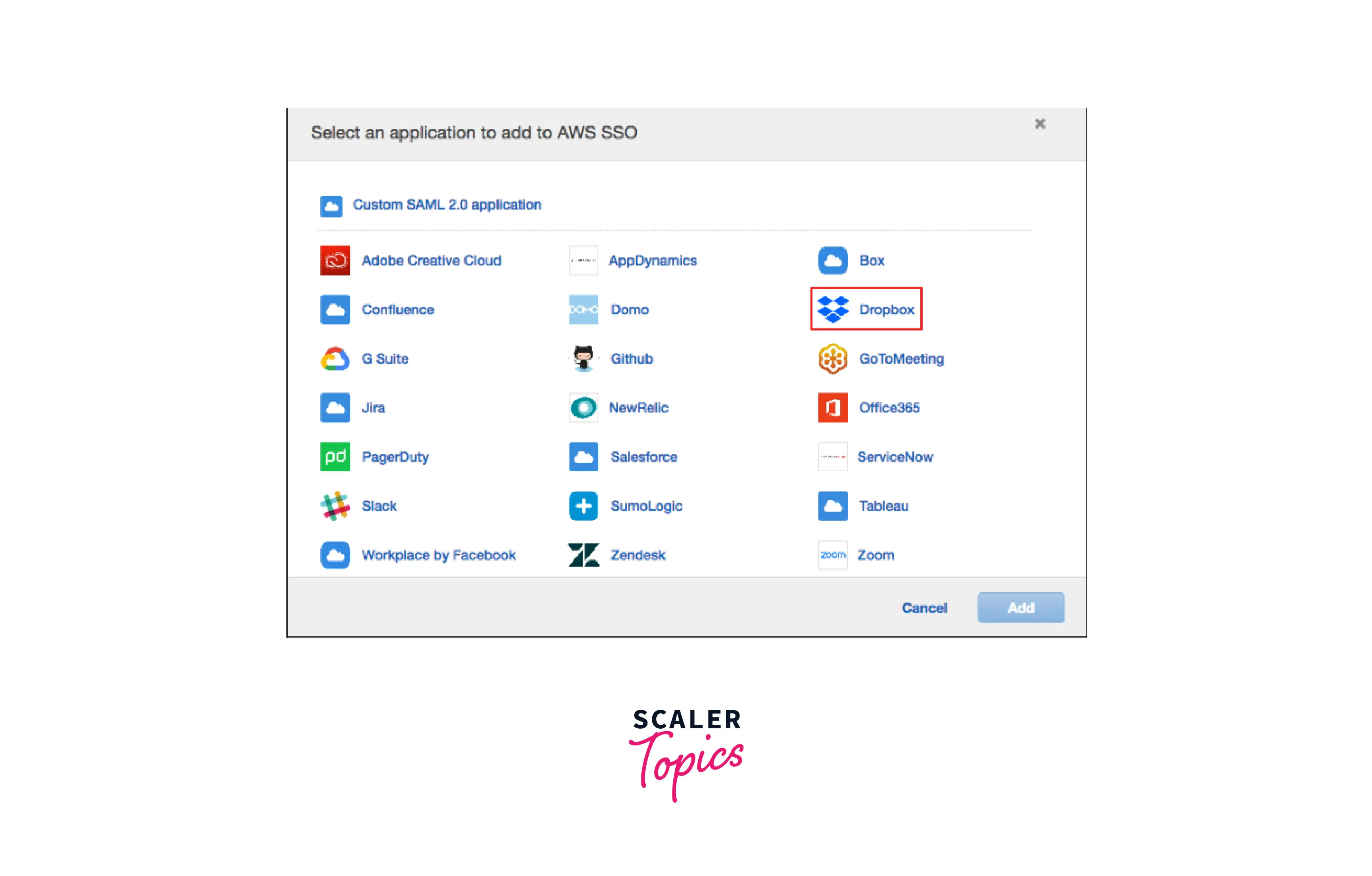 Built-in SSO integrations For many widely used corporate apps, including Office 365, Salesforce, and Box, AWS SSO offers built-in SSO connectors and detailed implementation guides.